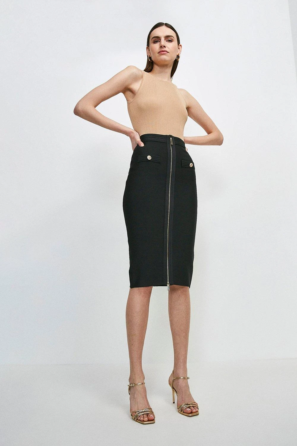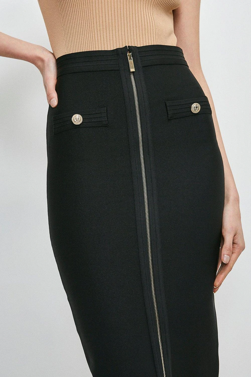 Beautifully moulded to each contour of your frame, this pencil skirt is the key to instant confidence. Hugging you in all the right places thanks to its special bandage knit fabric, the piece is luxuriously detailed with a glossy front zipper, military-inspired buttons and textured trims.