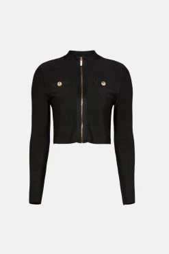 Crafted in a form-fitting bandage knit, this jacket is a super versatile and super flattering piece. Whether worn zipped up or left open, your figure remains beautifully defined. Elevated by luxurious military buttons and textured trims, it adds instant polish to anything you pair it with.