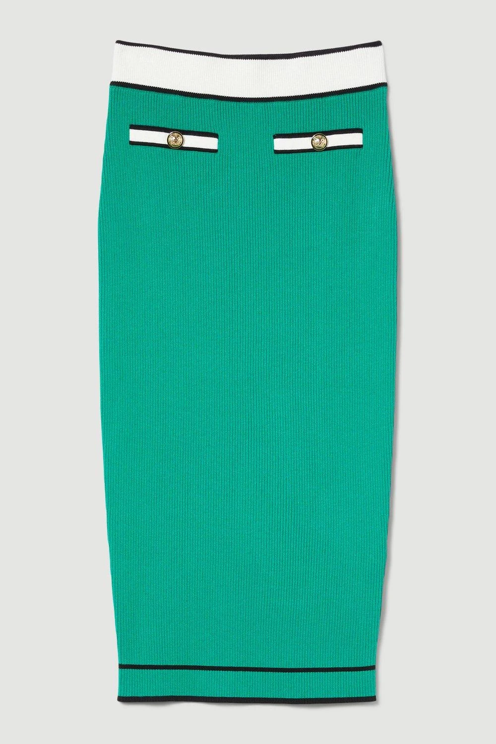 Crafted in a ribbed knit material for a comfortable fit, this midi skirt can be styled throughout the seasons. Embossed military buttons add a classic touch, while a contrast bandage detail nods to a contemporary mood. Style this piece with the co-ordinating top for a put-together look.