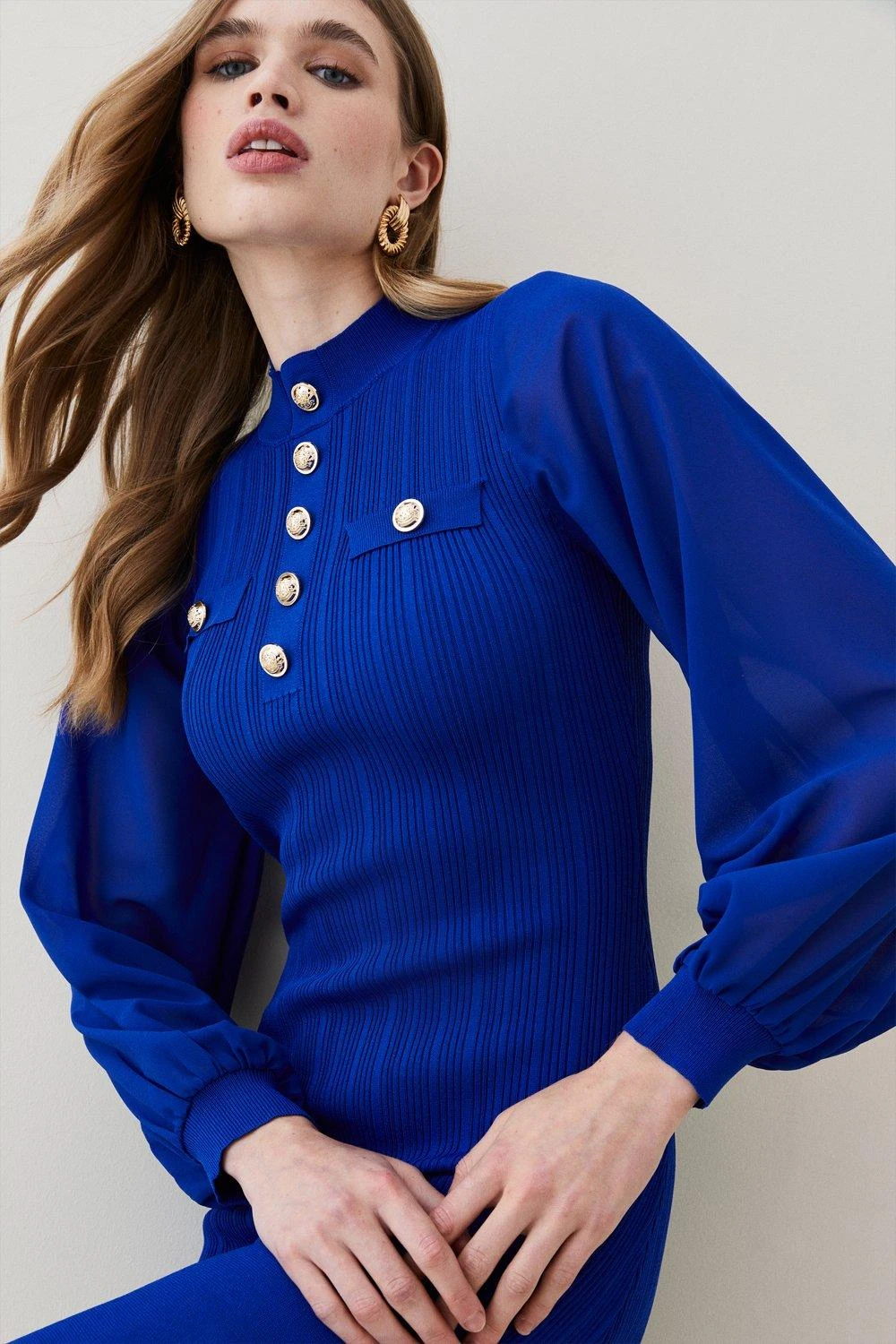 A winning blend of playful and sophisticated, this ribbed knit midi dress features puffed chiffon sleeves anchored by glossy, military-style buttons. A feminine frill adorns the hem, further adding to the feminine allure of this coveted new-season design.