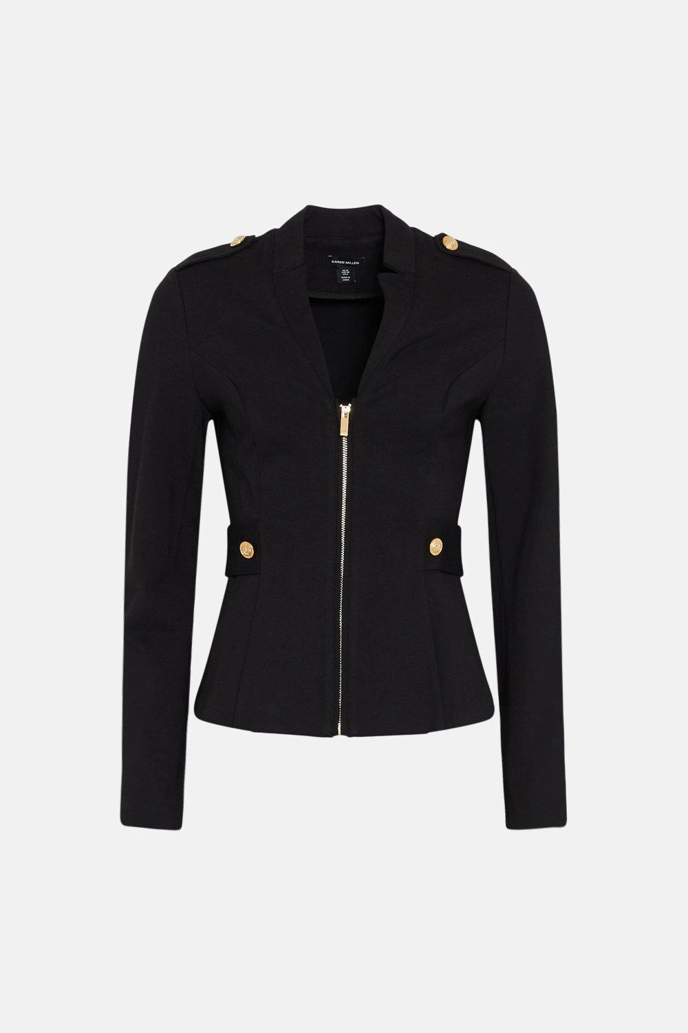 Our trademark tailoring is reimagined with sharp finesse for this military-imbued blazer. Crafted from a sculpting Ponte composition, it has a notched neckline and embossed buttons to the font.