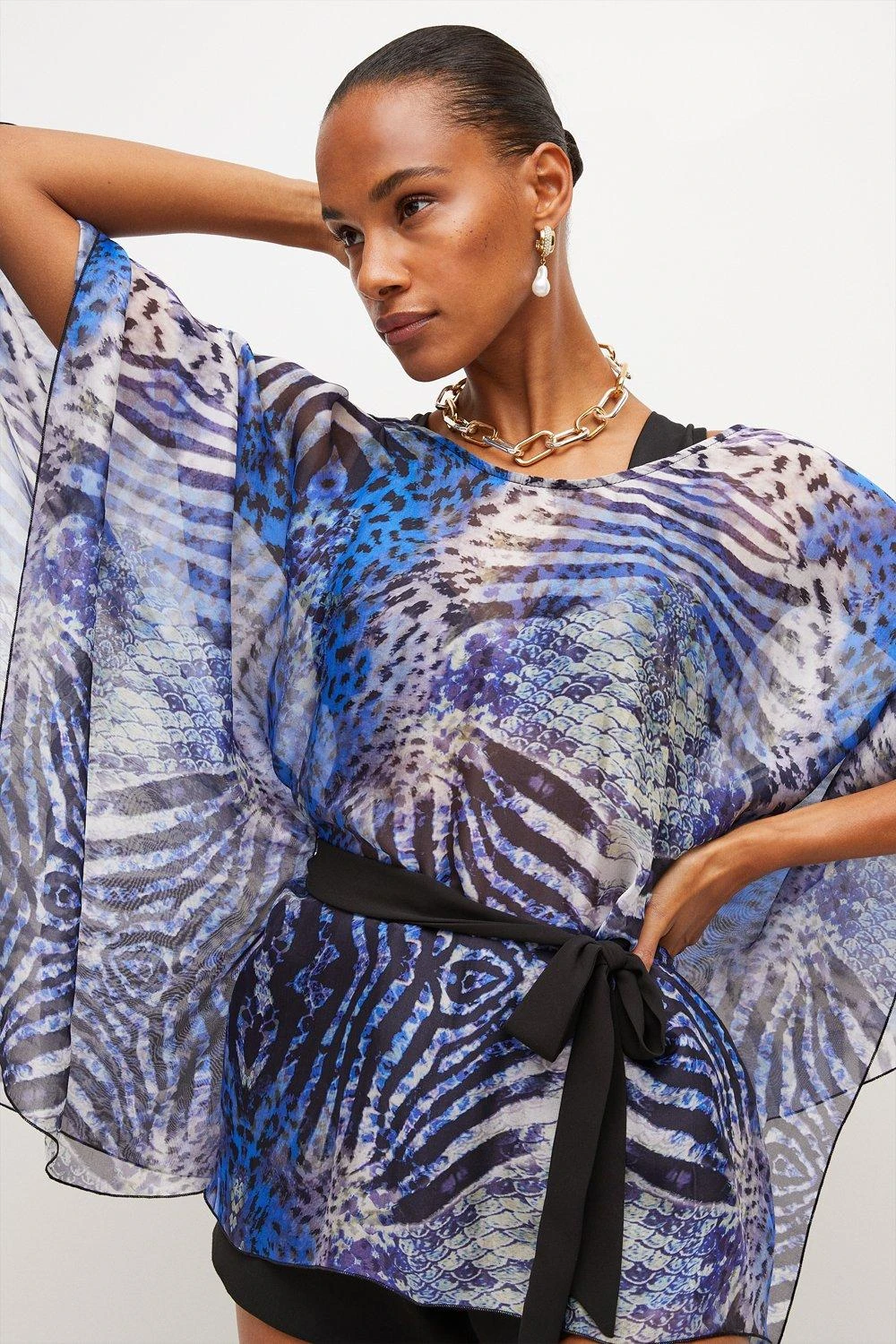 Made for glamorous getaways, this airy kimono top blends statement flared sleeves with a waist-cinching ribbon belt and impactful mirrored zebra print. Balance the trailing silhouette and vibrant colours with tailored black shorts for beachside strolls or a day of city break sightseeing.