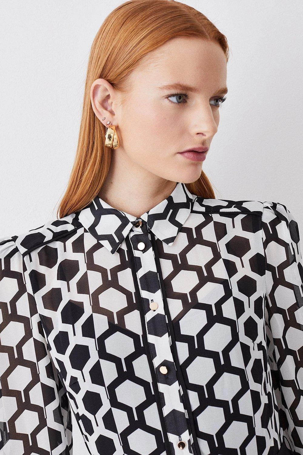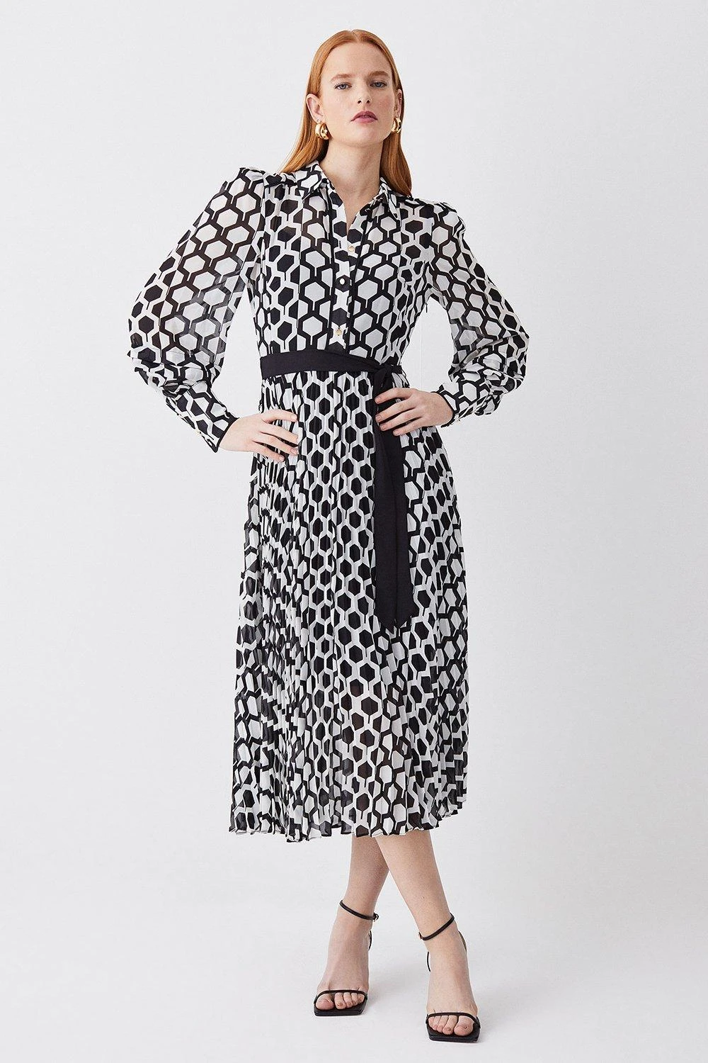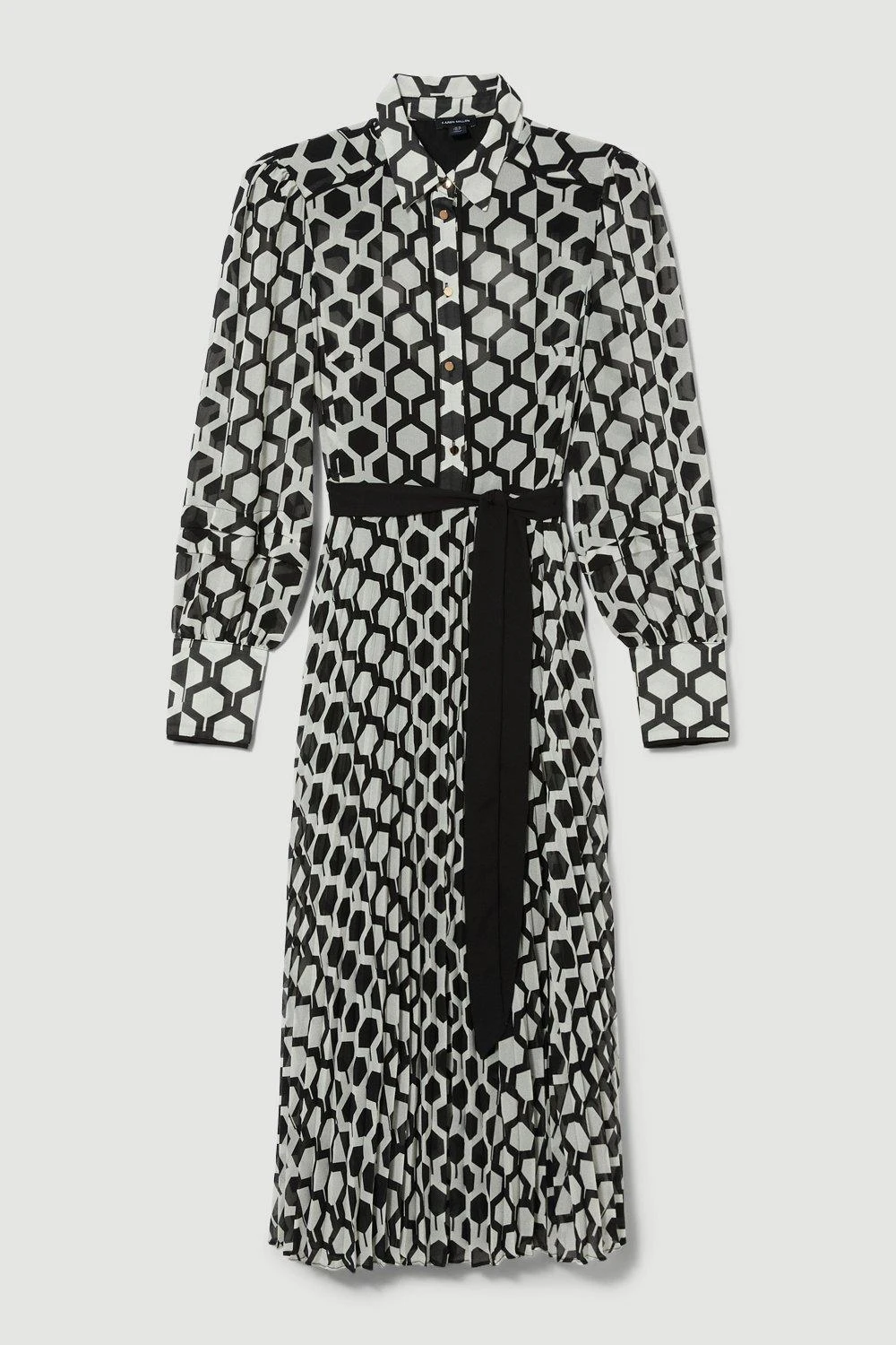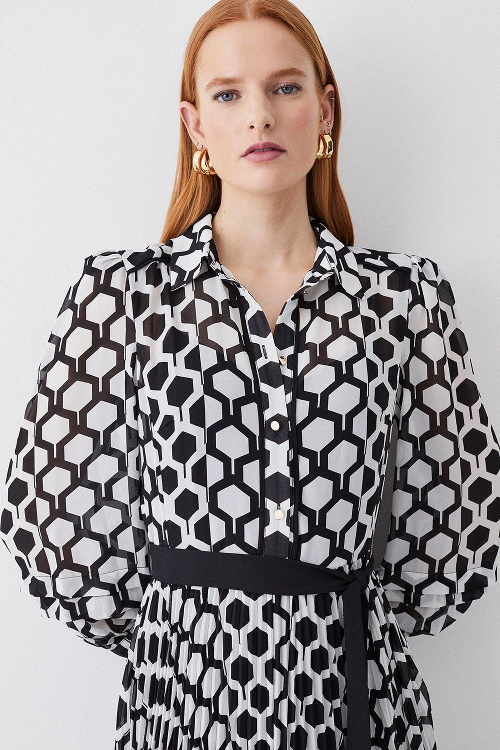 Defined by an intricate geo pattern and monochrome palette, this dress exudes classic elegance. A tie waist detail cinches the waist to add definition to this fluid silhouette, characterised by a soft pleated skirt and balloon sleeves.