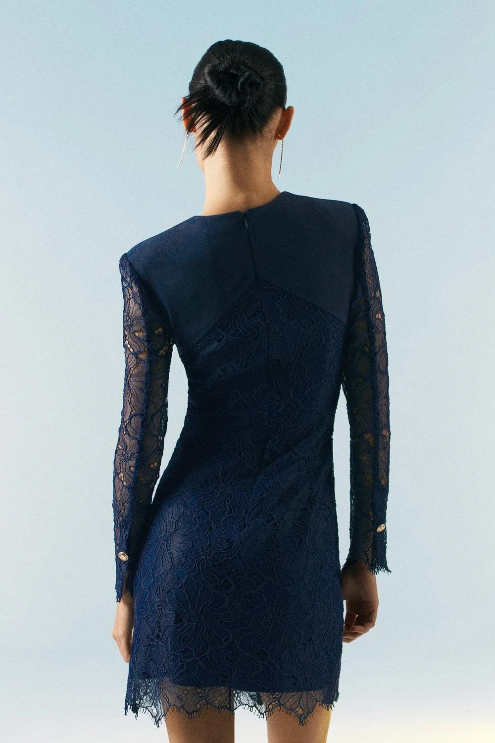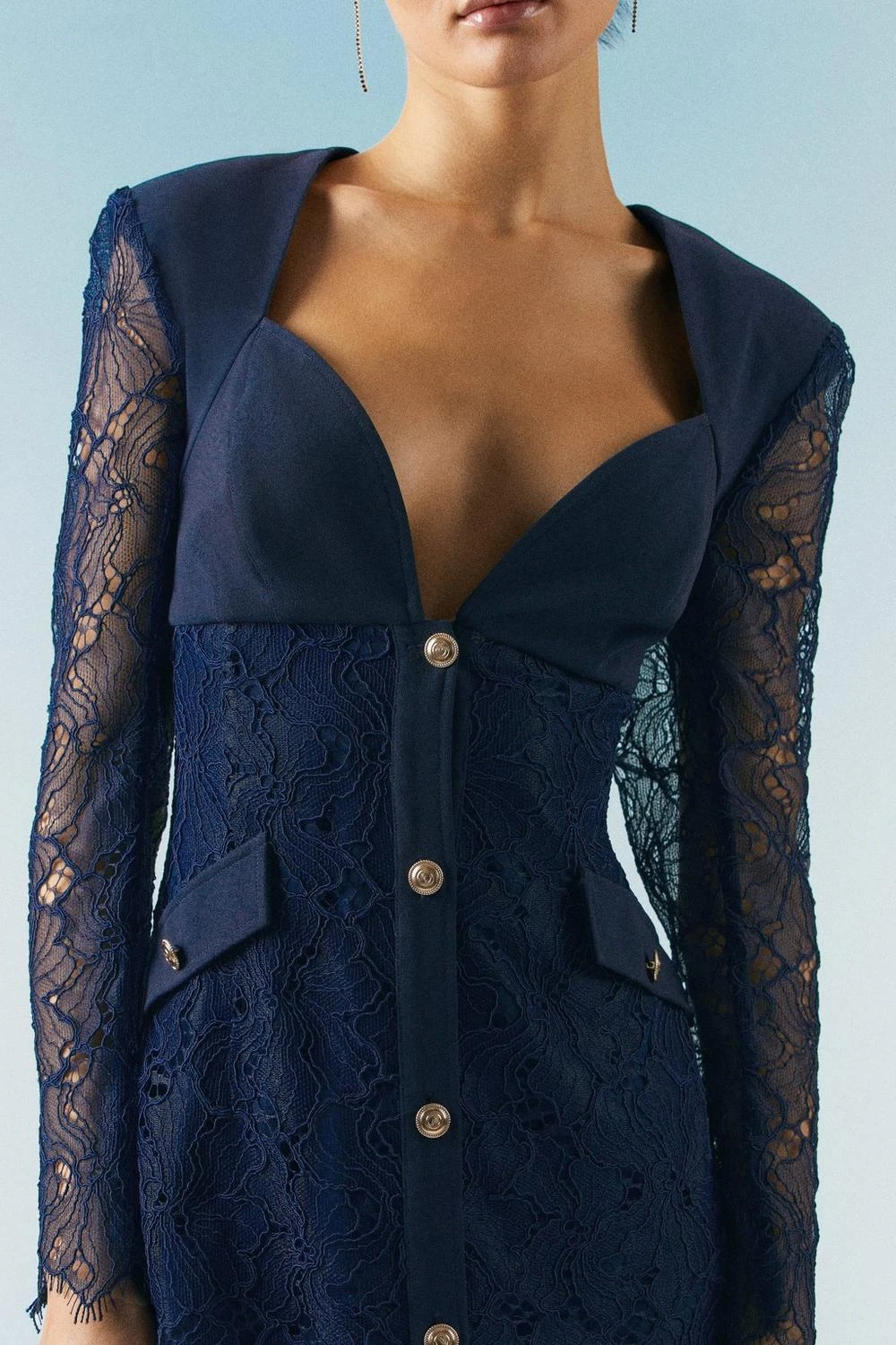 Take a refined approach to romantic dressing in this lace mini dress. A sweetheart neckline creates an ultra-feminine silhouette, which is complemented by long sleeves and a delicate lace overlay. Decorative flap pockets and gold-tone buttons add a polished finish.