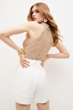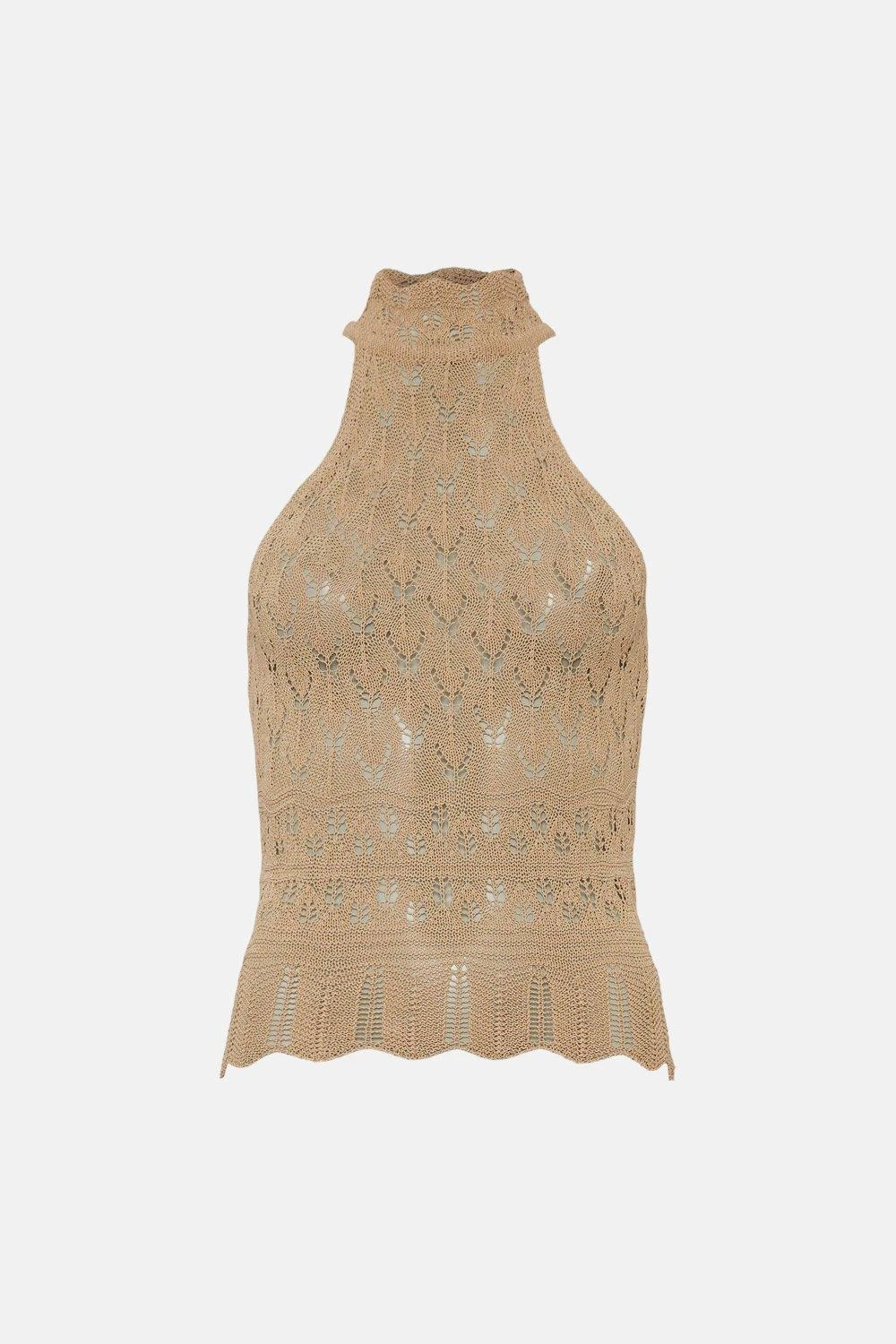 Bringing a subtle bohemian twist to your top collection, this knitted halter top shows off an open-stitch finish and luxe, slinky feel. The high halter neckline exposes sun-kissed shoulders beautifully, offsetting a curve-skimming fit and subtly flared hemline.