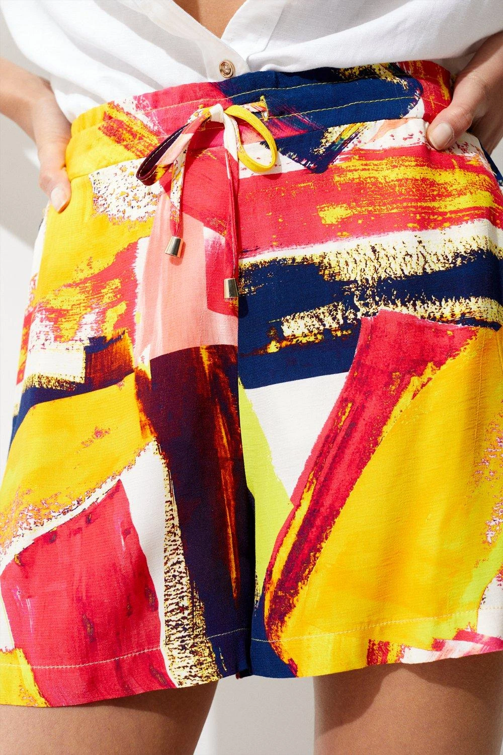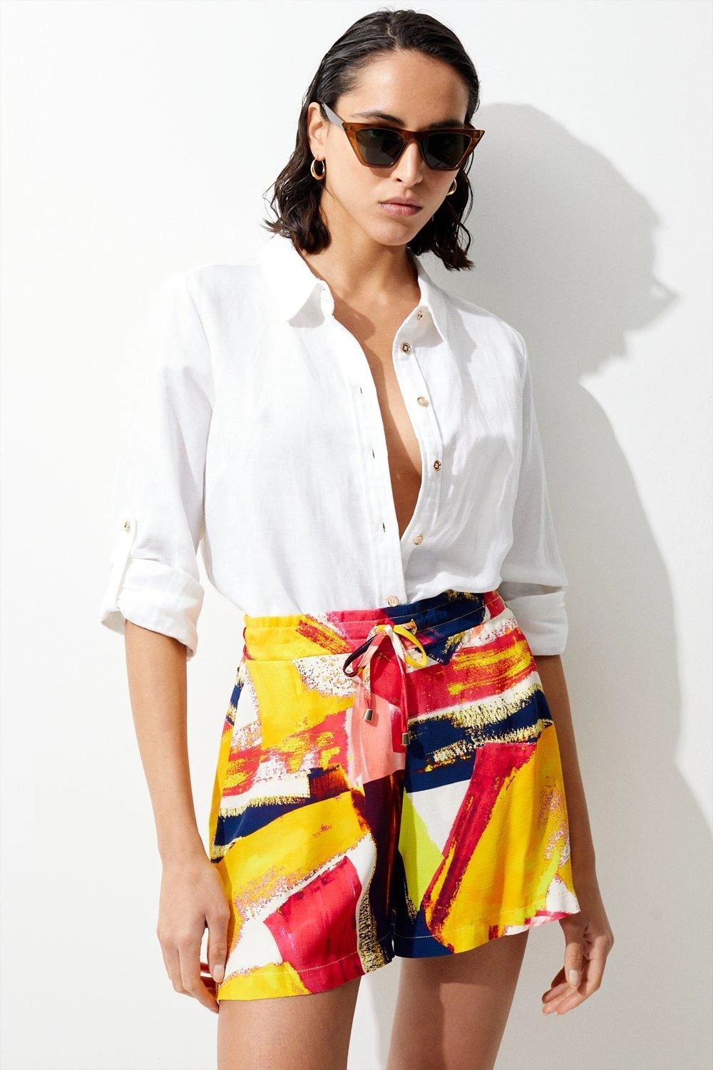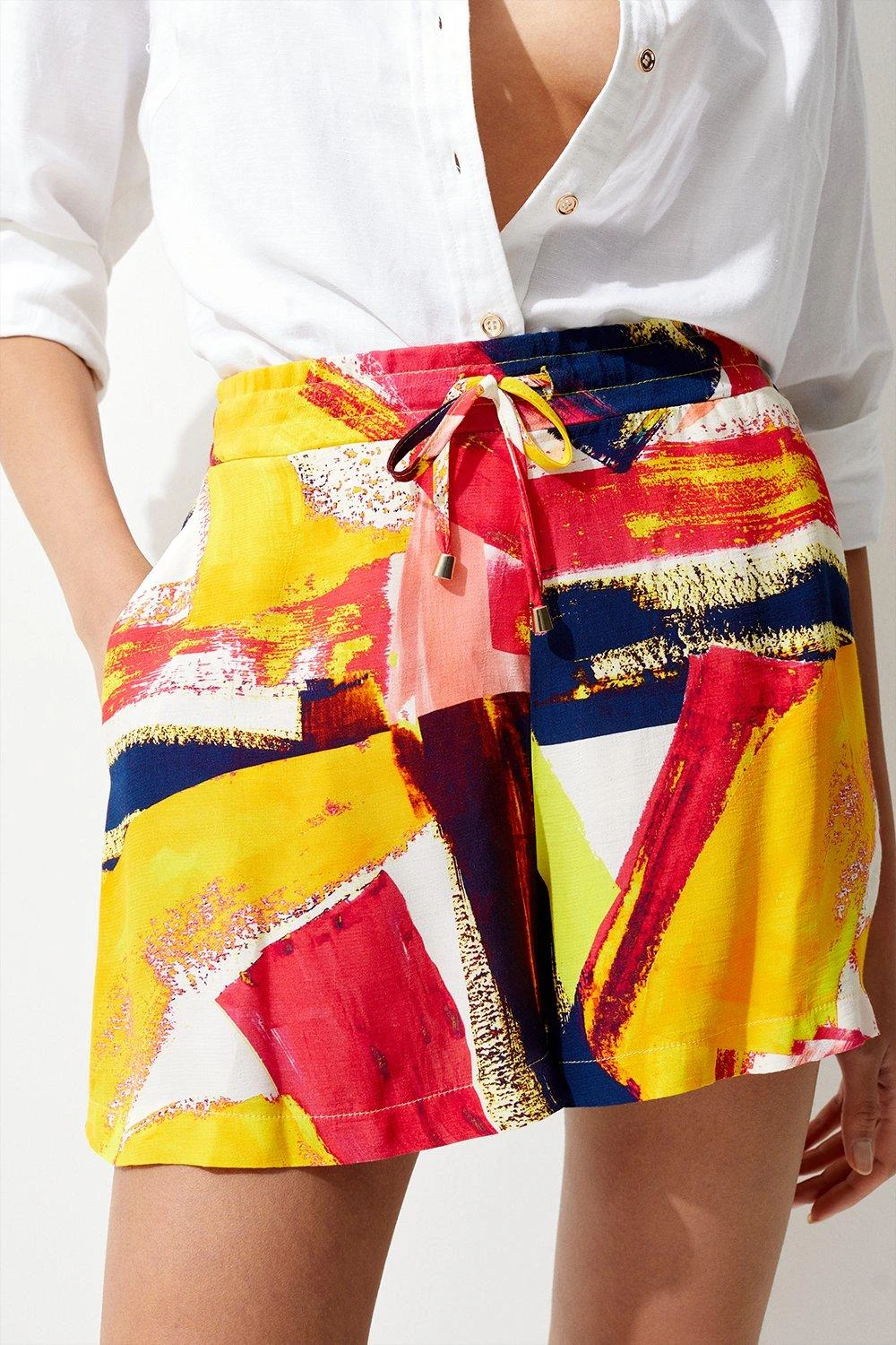 Enhanced with an abstract paint stroke print, these shorts add a touch of artisanal allure to summer ensembles. This pair is crafted from lightweight fabric for a breezy, relaxed feel. Style these shorts with a linen shirt and sandals to exude understated elegance on your next getaway.