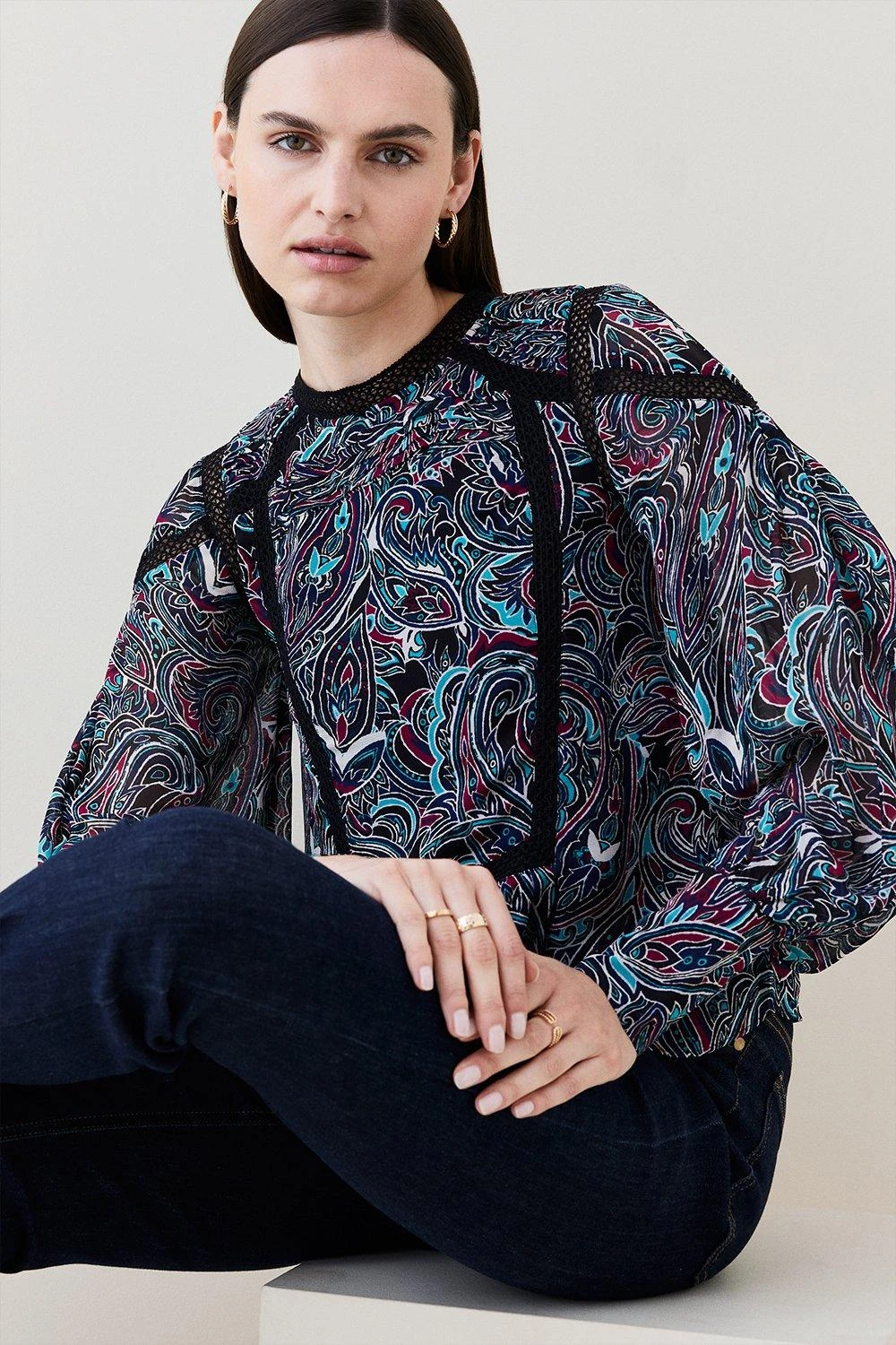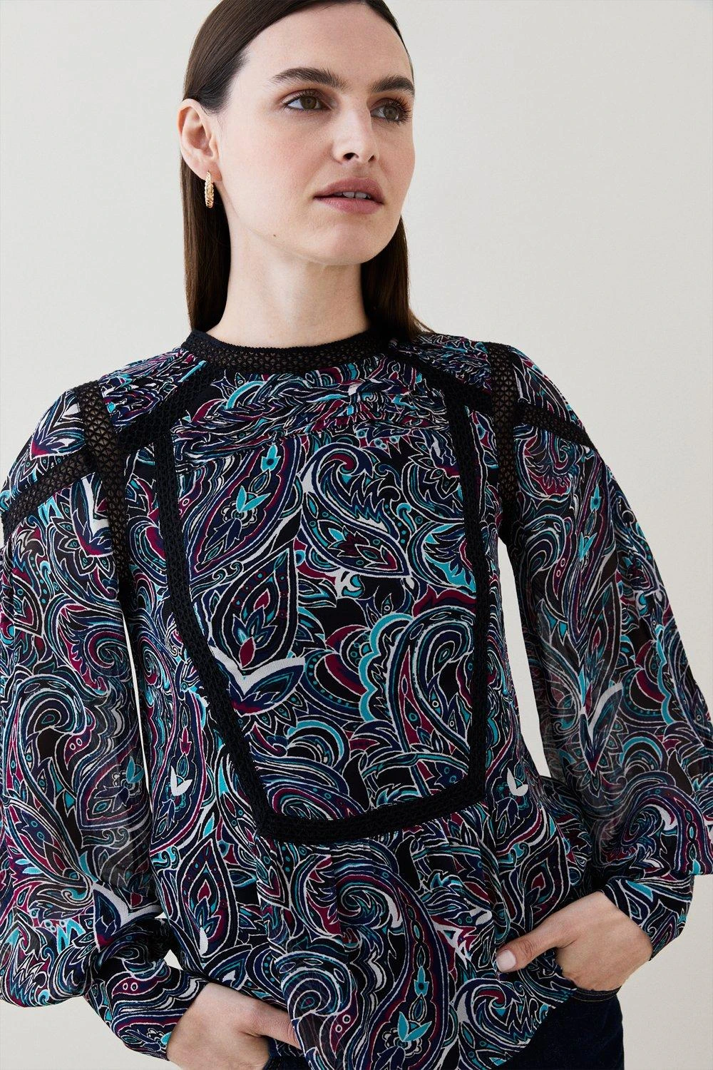 Vintage-inspired paisley is updated with modern reverence for this voluminous blouse. Guided by laddered trim detailing that creates panelled vision, it has playfully puffed sleeves for a whimsical finish.
