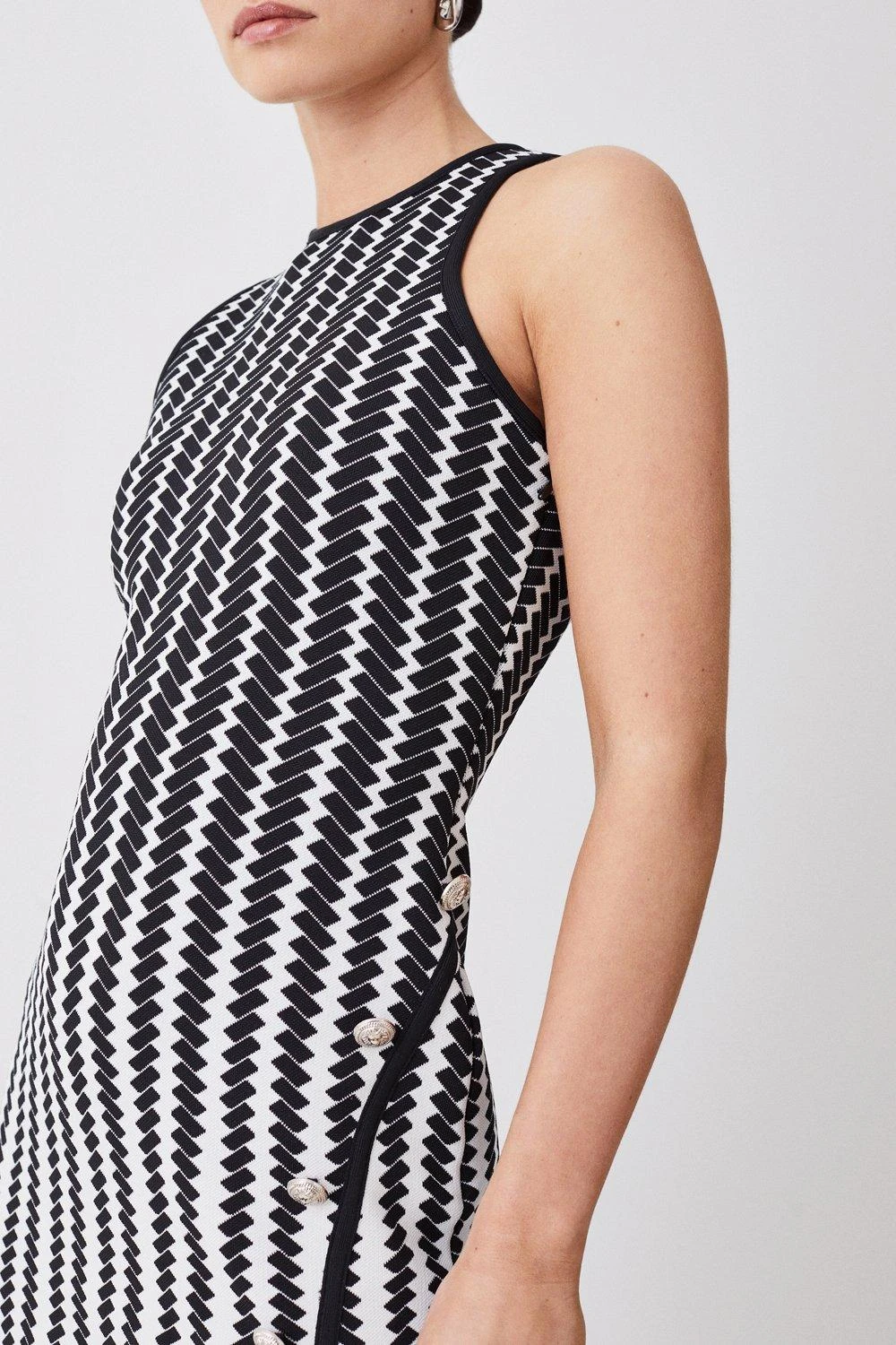 Crafted in an intricate geometrical pattern, this dress exudes contemporary appeal. An ombre design creates an optical illusion, while a lightweight knit fabric gently hugs the form. Embossed buttons add a premium finish.