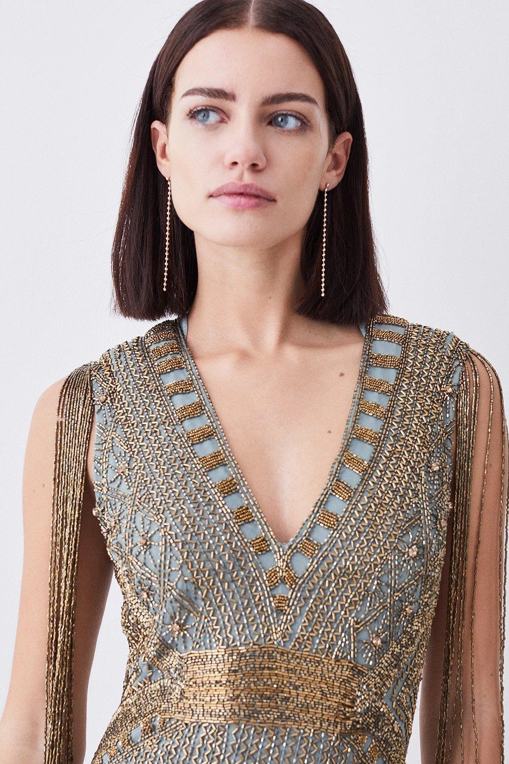 For those occasions when only high-voltage glamour will do, choose this dress. Nodding to the opulence of another era, it shows off trailing beaded tassels for a dramatic sense of movement. The classic V-neck bodice comes complemented by a crystal-scattered maxi skirt and yet more opulent tassels for an undeniably dramatic twist.