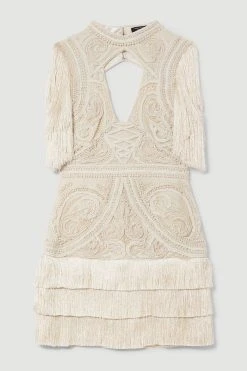 Intricately embellished and fringed with tiered layers that swish with every step, this bright red dress is a true show-stopper. Contemporary cut-outs and tassel-edged sleeves bring a flirty twist to this curve-contouring design, which is begging to be taken on a very special night out.