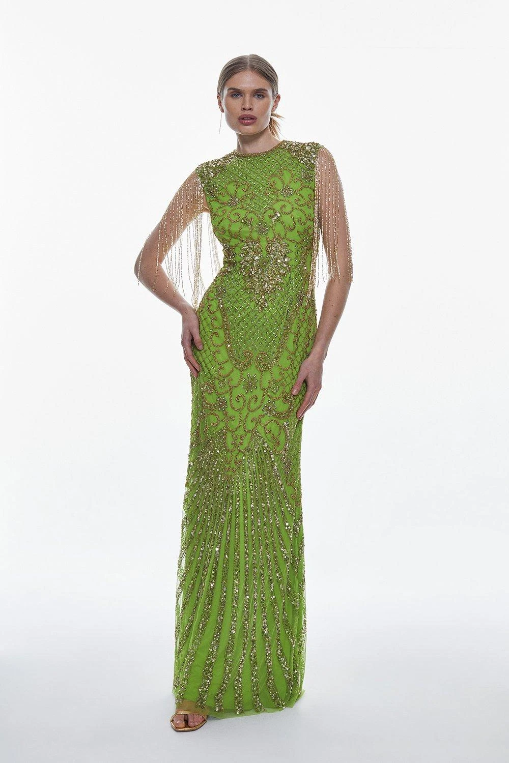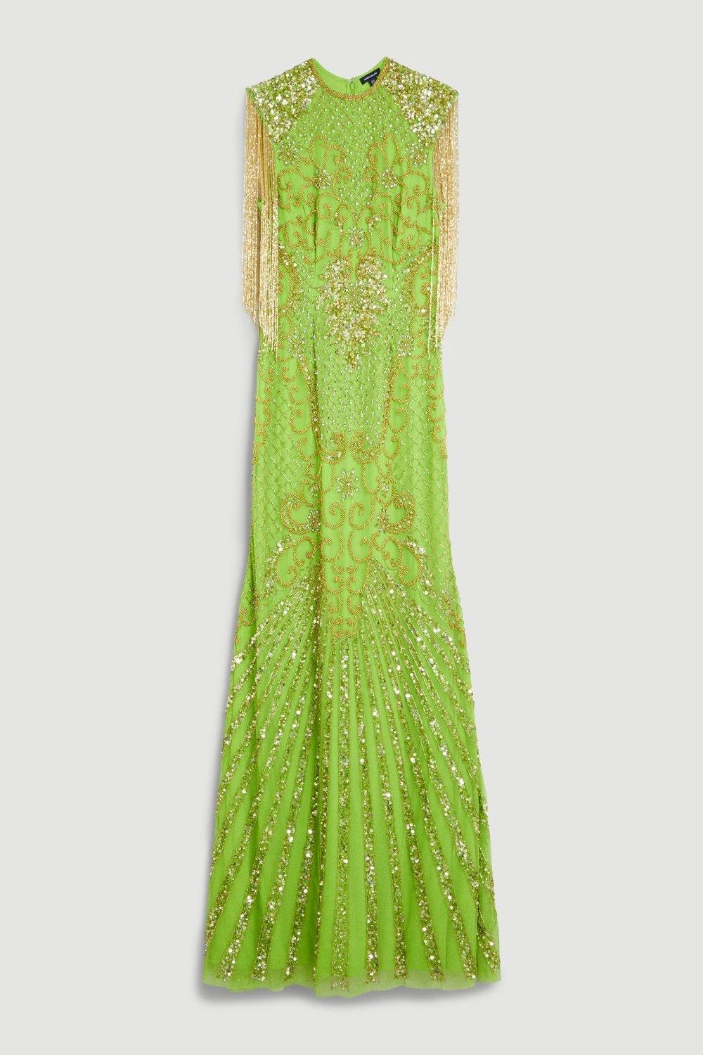 Cascading with glistening tassels and crystal embellishments, this floor-length gown is a true showstopper. A gauzy, semi-sheer overlay adds an elegant touch to this opulent design. Style this standout piece with heels for an unforgettable ensemble.