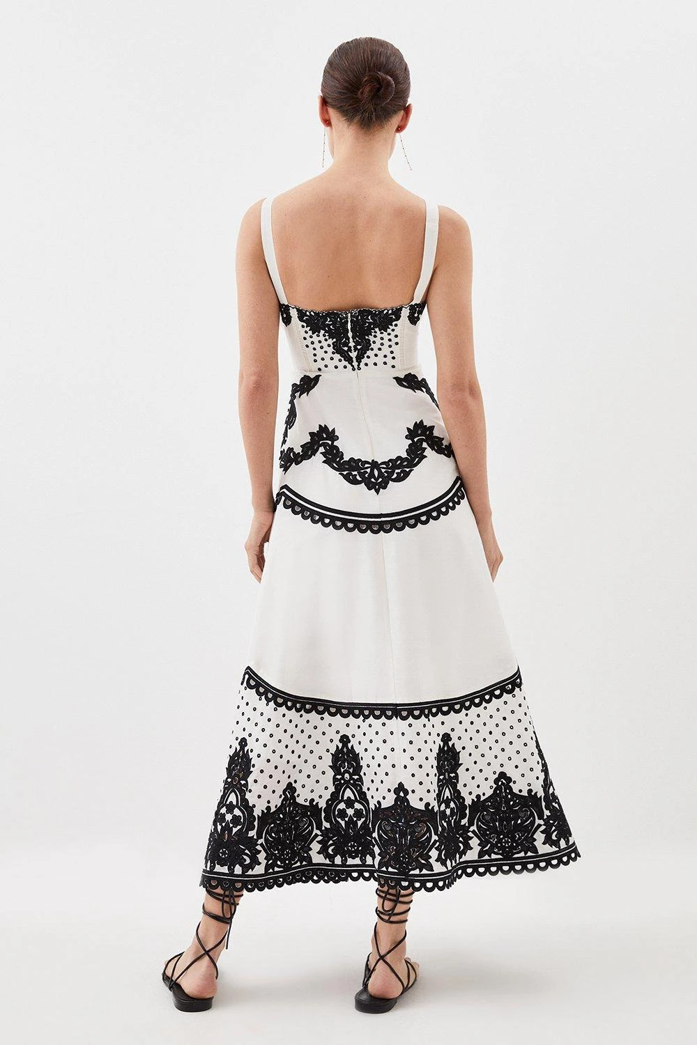Detailed with intricate lace details and a polka dot pattern, this midi dress exudes a classic aesthetic. Crafted with lightweight cotton, this piece boasts warm-weather appeal, style it with sandals for an elevated everyday look, or pair with heels for special occasions.