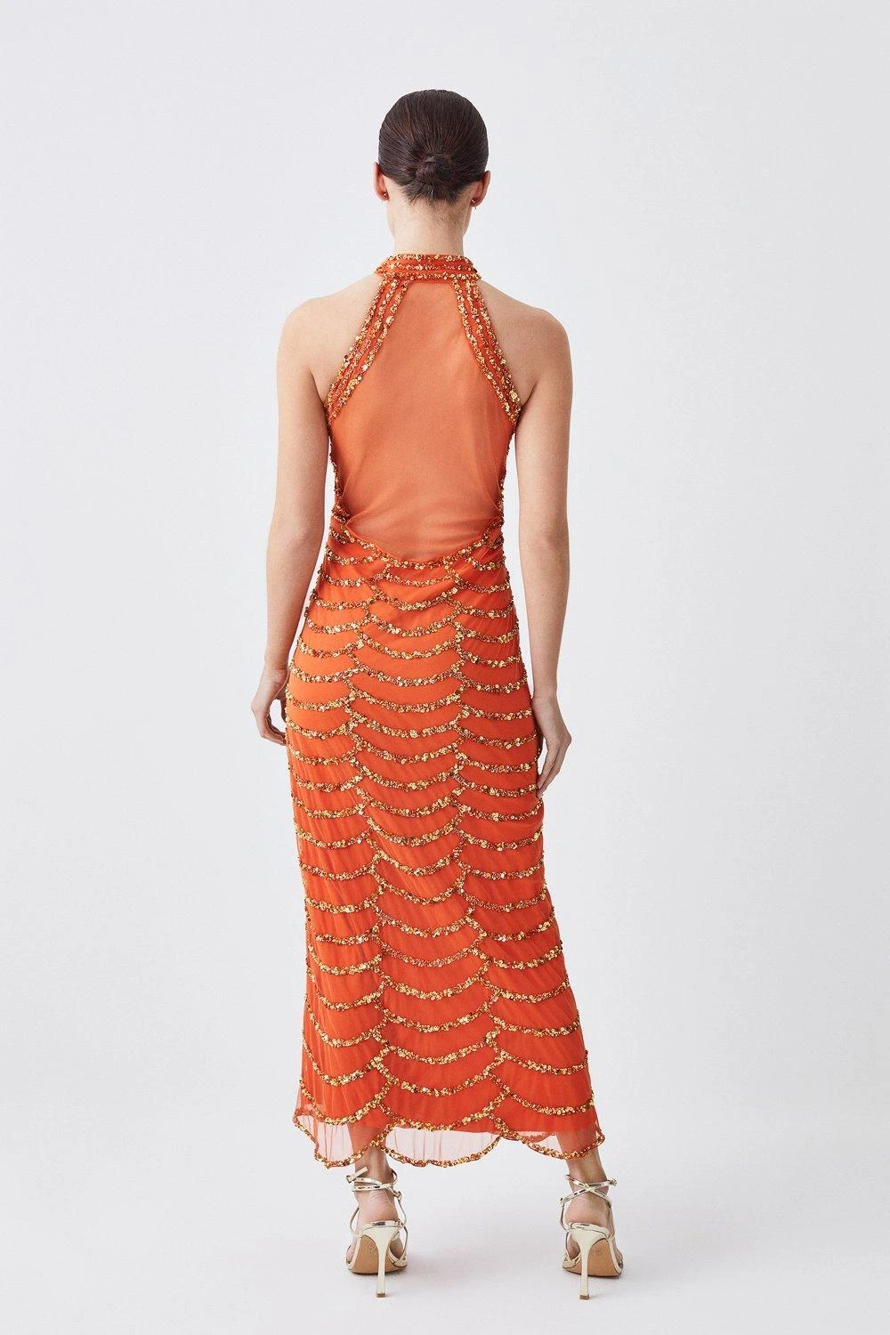 This gleaming maxi dress needs no introduction. Intricate sequin details create a flattering draped effect, further elevated by a scalloped hemline. The low back is draped with thin mesh material, adding a touch of elegance. Style this dress with pointed heels for a magnificent party look.