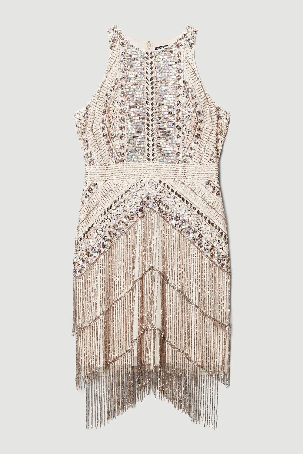 Add a touch of Old Hollywood glamour to your partywear repertoire with this dazzling fringed mini dress. Adorned with intricate sequins, claw crystals and fringe tassels that swish with every step, this dress encapsulates the ultimate party-ready mood.