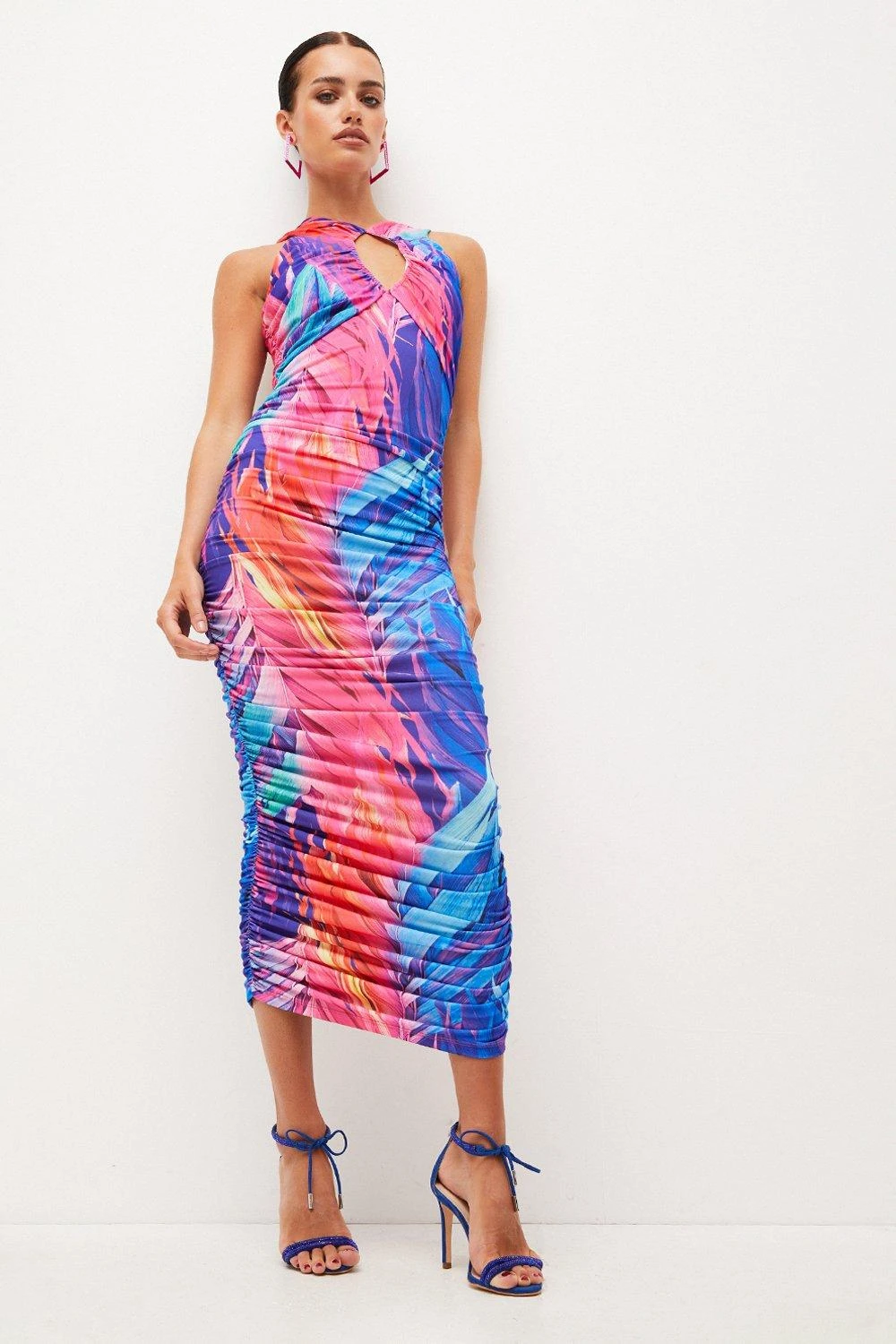 Combining a 90s-style tube silhouette with the season’s bold feather print, this stretch jersey crepe maxi dress ticks all the right style boxes for your next night out. Thick shoulder straps offset a modern front cut-out and textured ruching that seamlessly frames and enhances your figure.