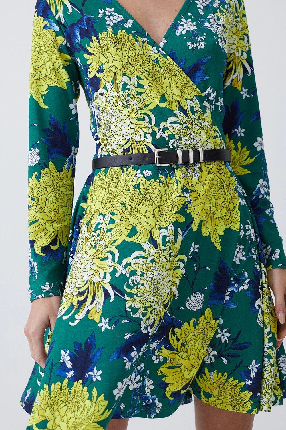 This standout dress is crafted with a soft jersey blend and designed with a vibrant peony floral print, making an instant statement. A deep V-neckline gives romantic appeal, while a skater skirt creates a flattering effect.
