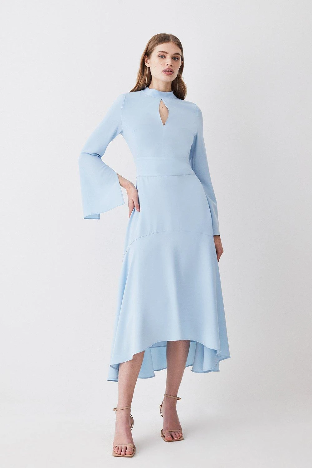 A combination of sultry and sophisticated, this midi dress exudes understated elegance. Flared sleeves add a touch of drama, while a high-low hemline creates a fluid silhouette. A high neckline and keyhole detail add a dynamic mood.