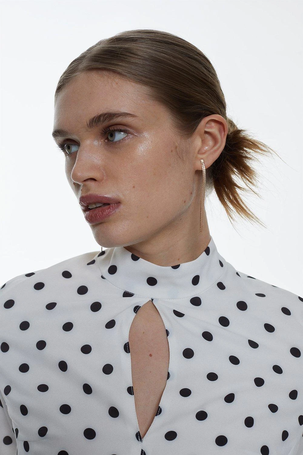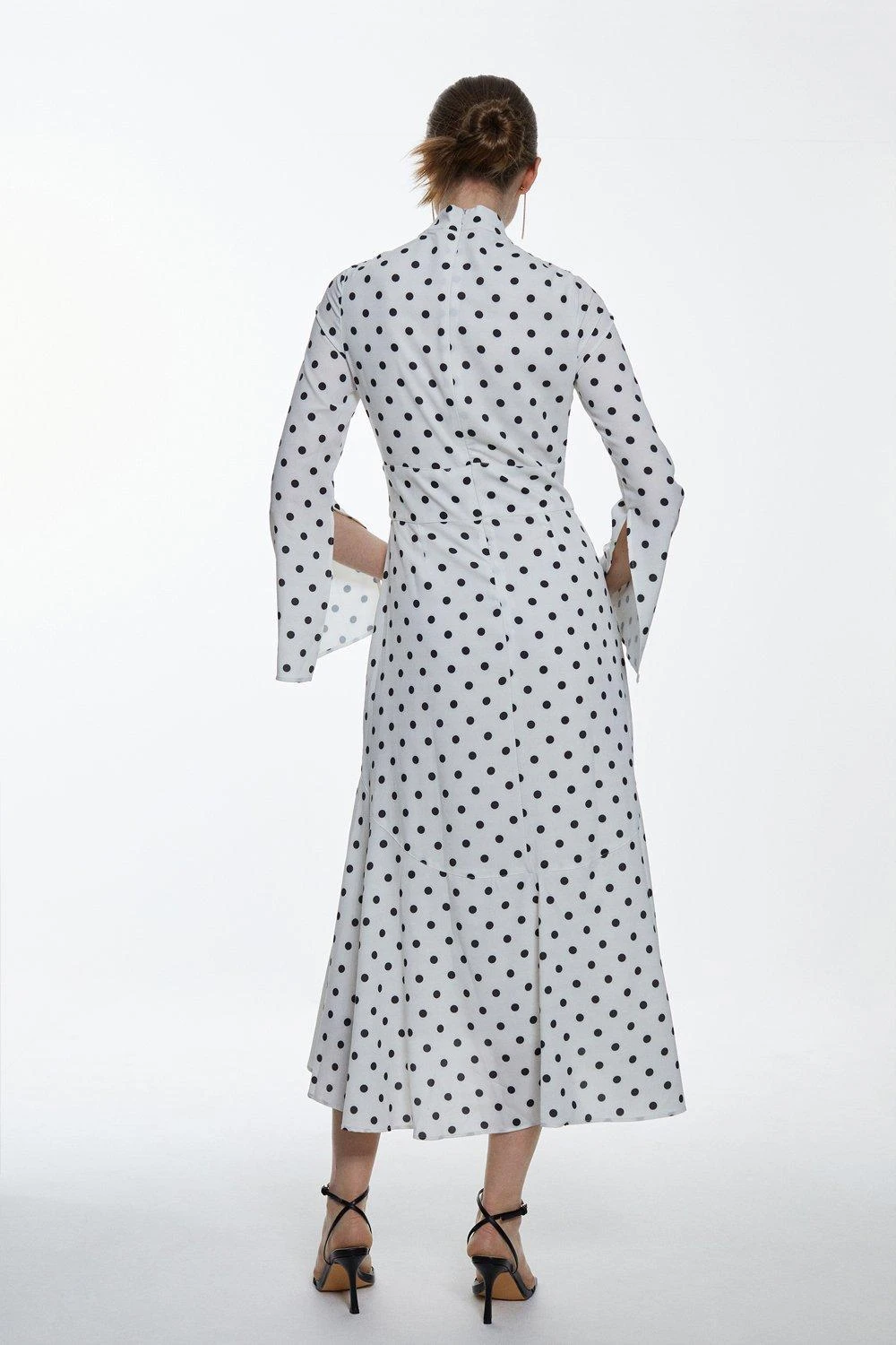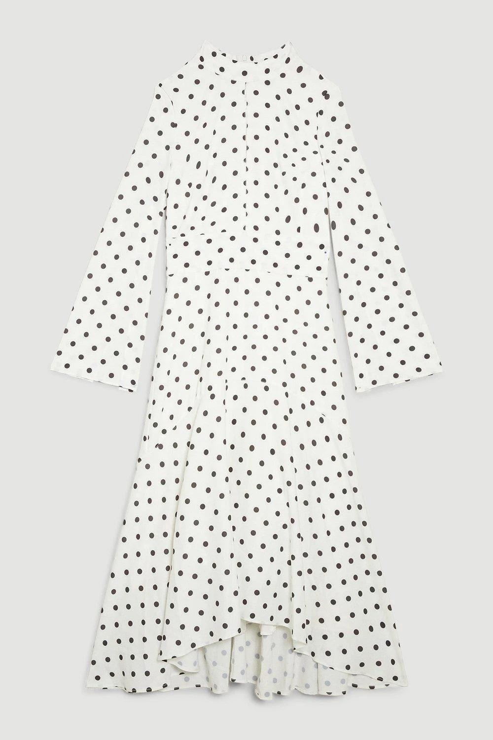 A combination of sultry and sophisticated, this midi dress exudes understated elegance. This piece is crafted in a classic monochrome palette, further emphasised by a polka dot print. Flared sleeves add a touch of drama, while a high-low hemline creates a fluid silhouette. A high neckline and keyhole detail add a polished finish.