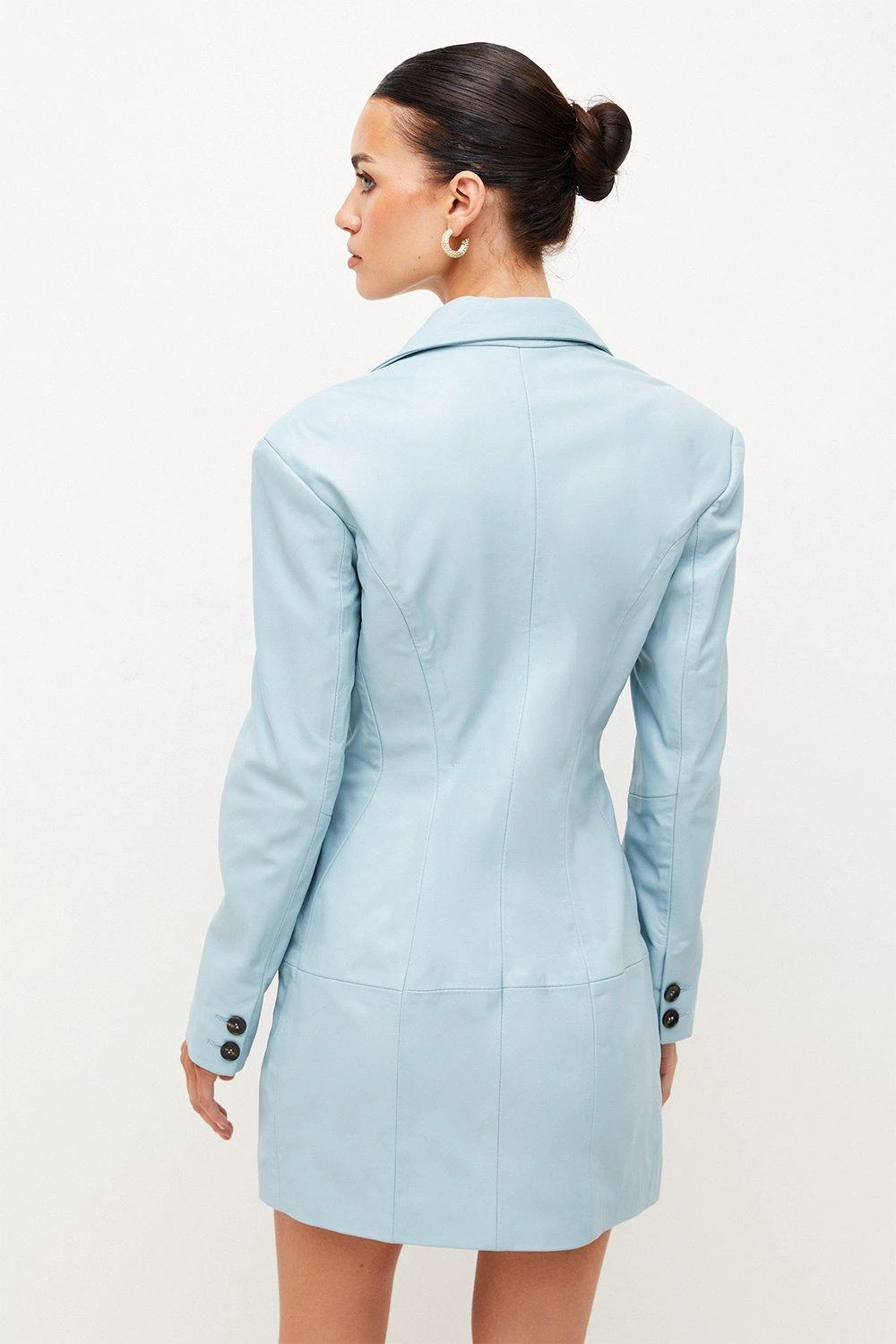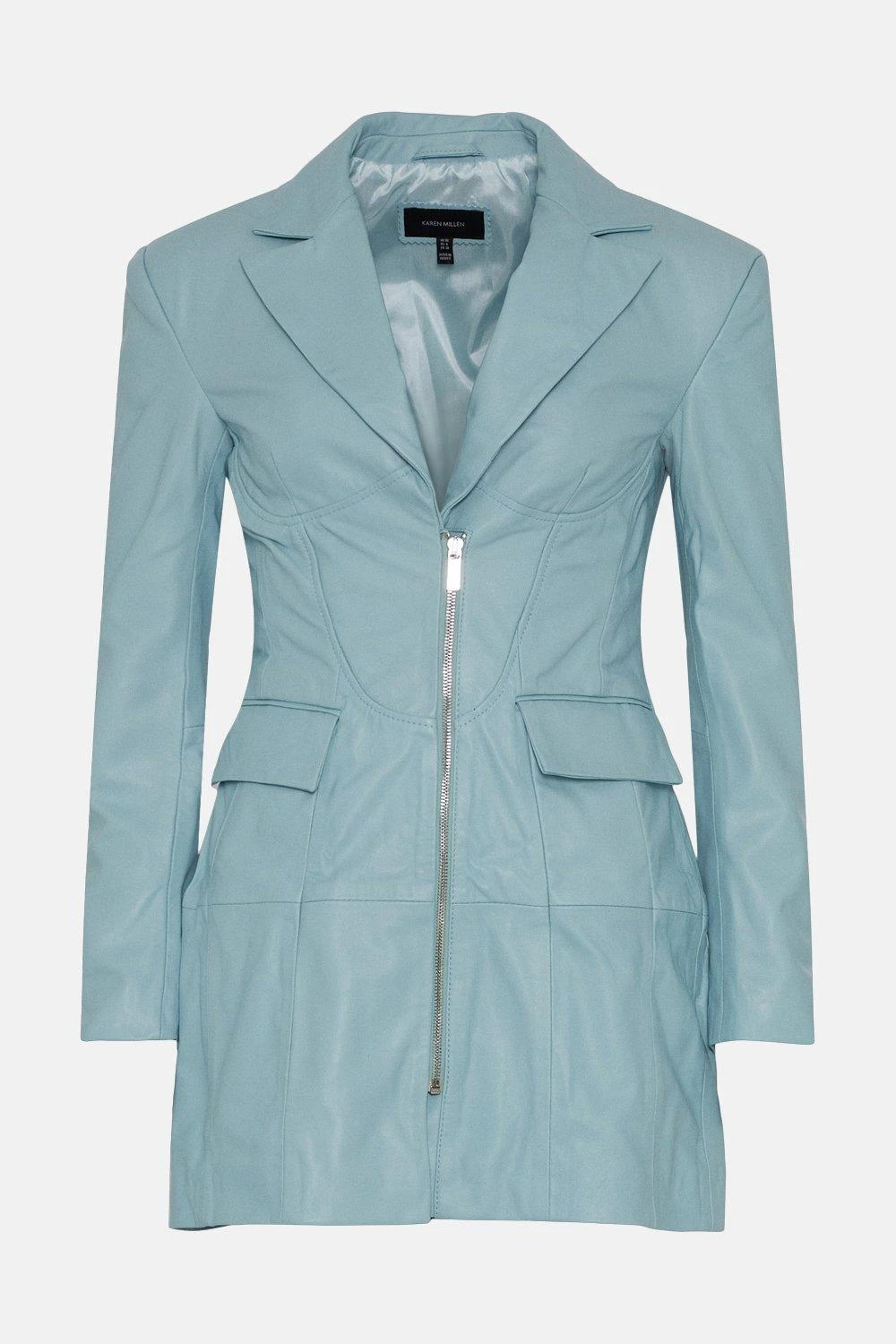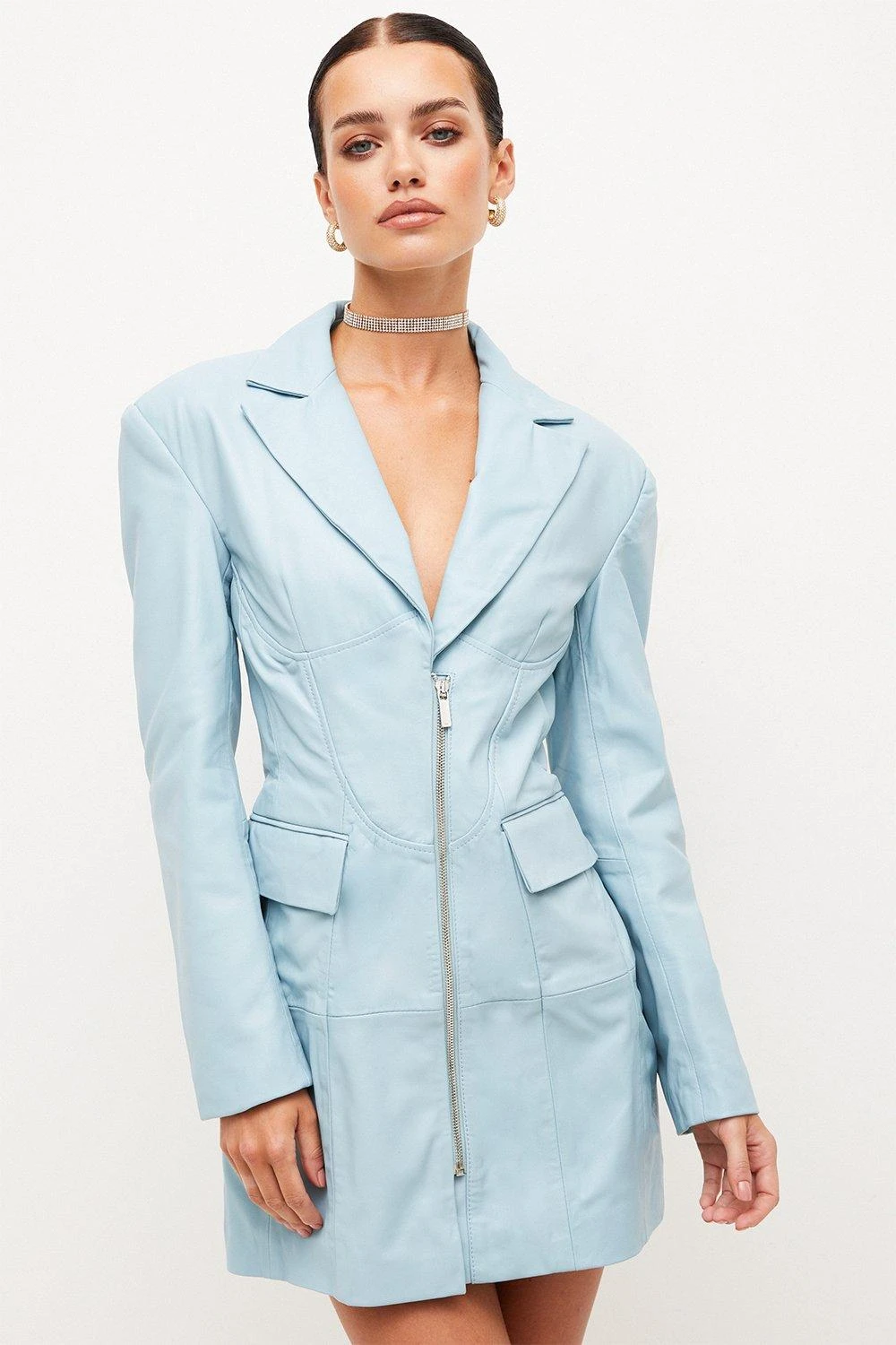 A blazer dress with a directional twist, this premium leather design was inspired by motocross culture and features a racy full-length zip, structured shoulders for a sense of volume and flap pockets. Cut to a sultry high hemline, it effortlessly elongates legs, styling perfectly with matching leather mules and a statement bag.