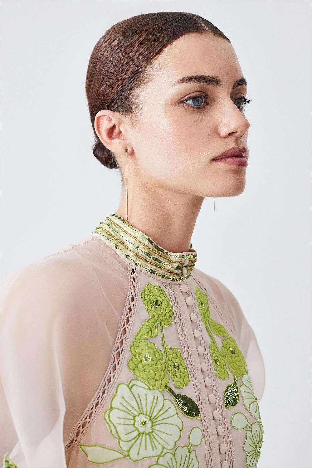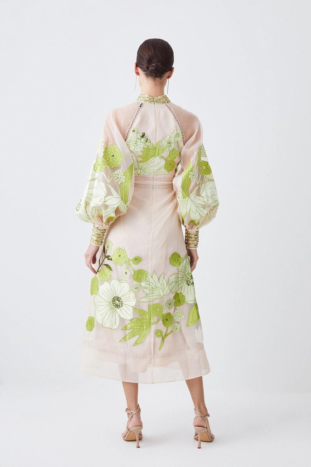 Crafted with vibrant floral applique motifs, this refined organdie dress exudes understated elegance. Intricate sequin embellishments around the neckline and cuffs add a glamorous touch, while sheer balloon sleeves add an ethereal element.