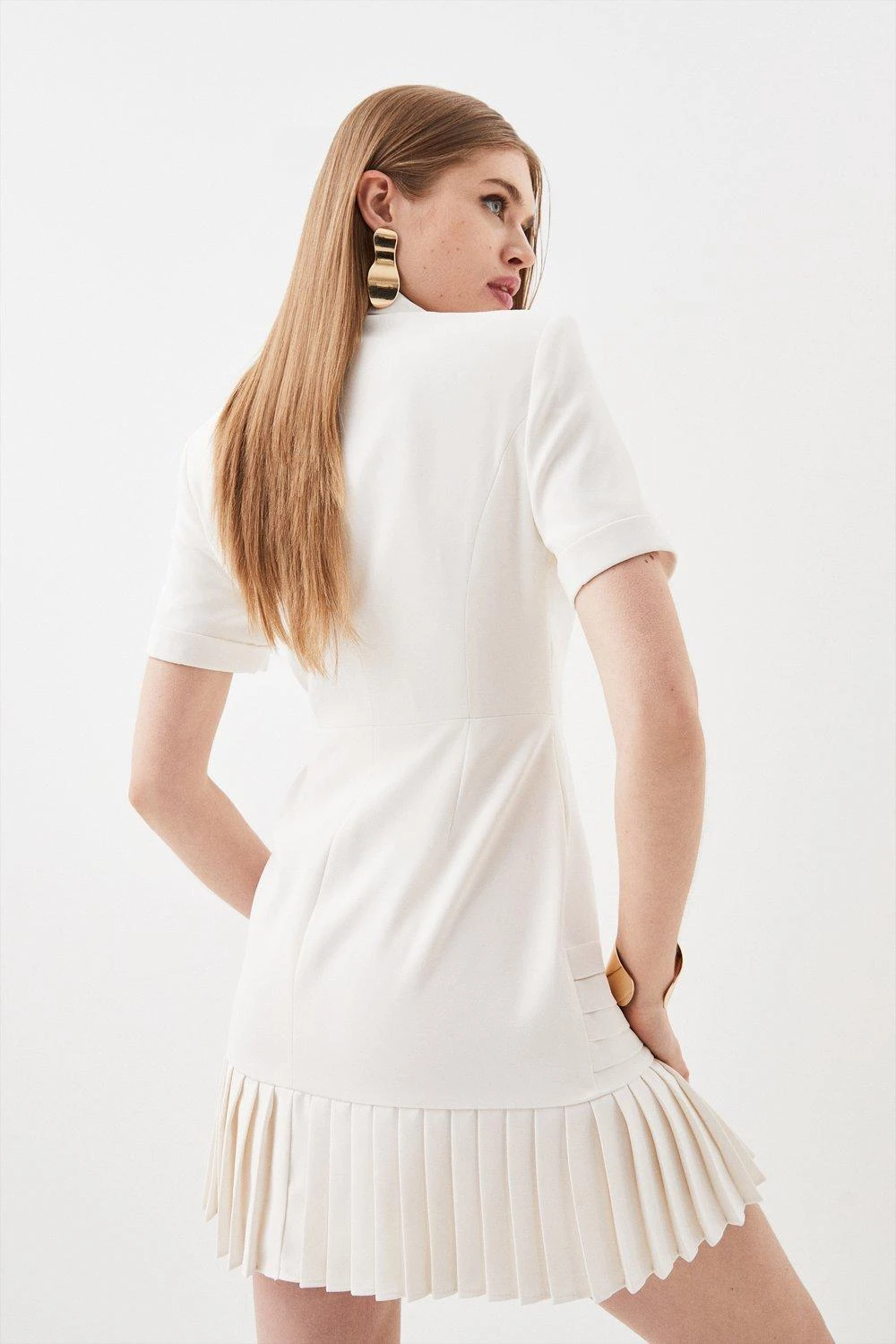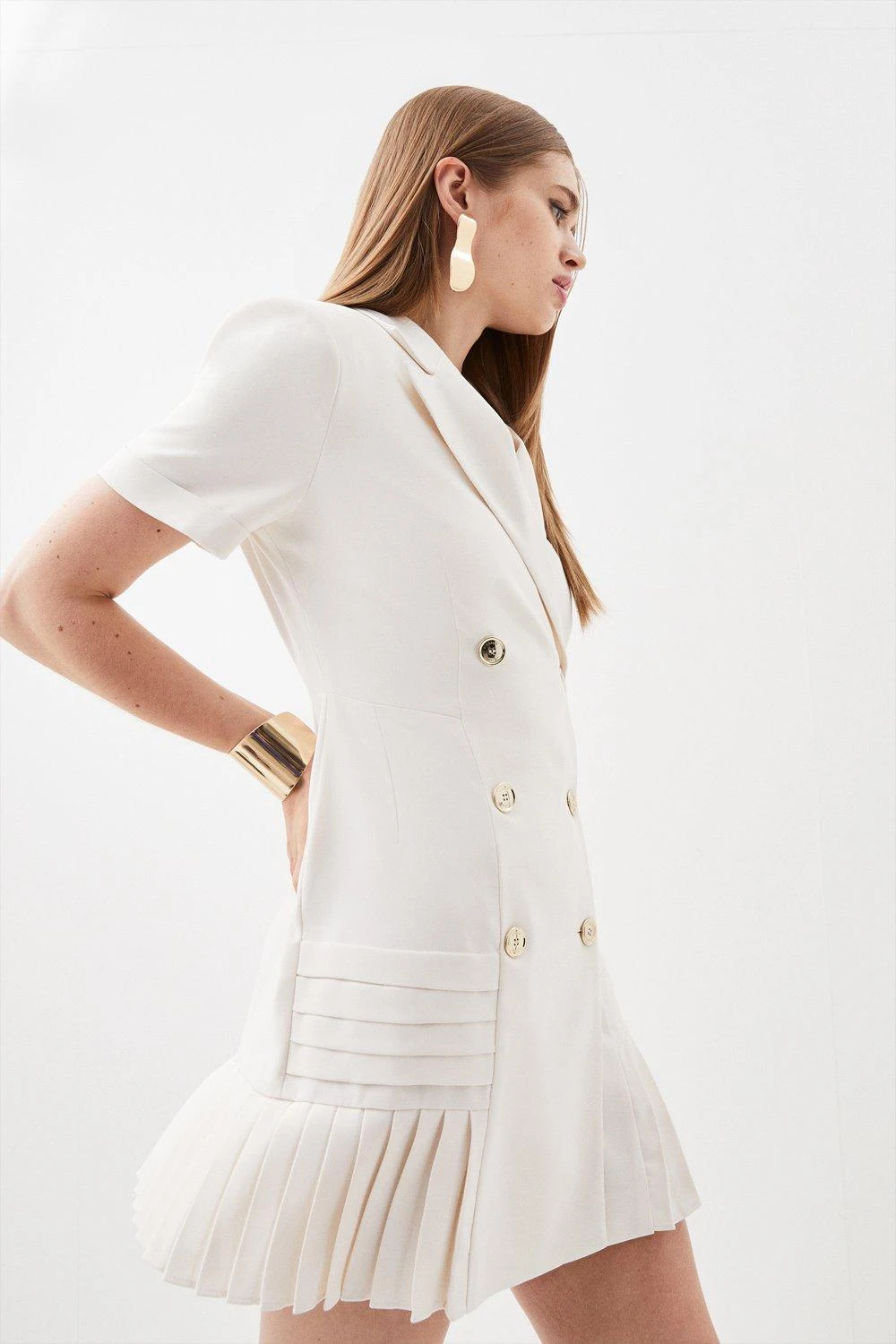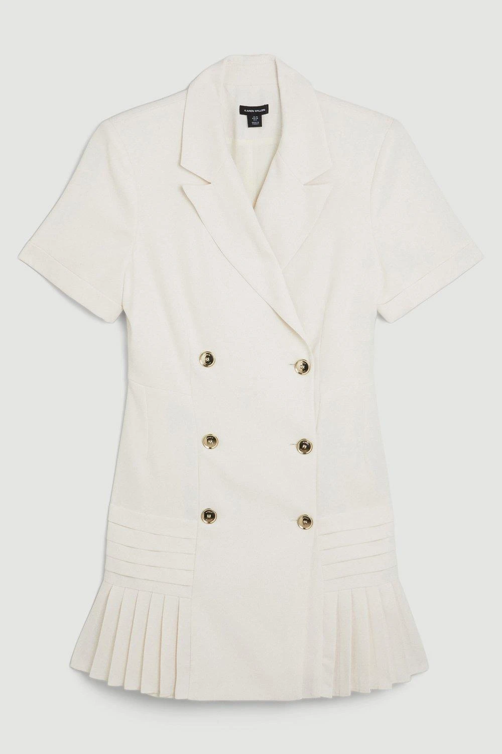 Exude a polished aesthetic in this pleated mini dress. Notched lapels add a classic touch, while contrasting pleated details exude a contemporary mood. Glossy double breasted buttons provide a luxurious finish. Style this piece with loafers for an elegant office look, or elevate with heels and accessories.