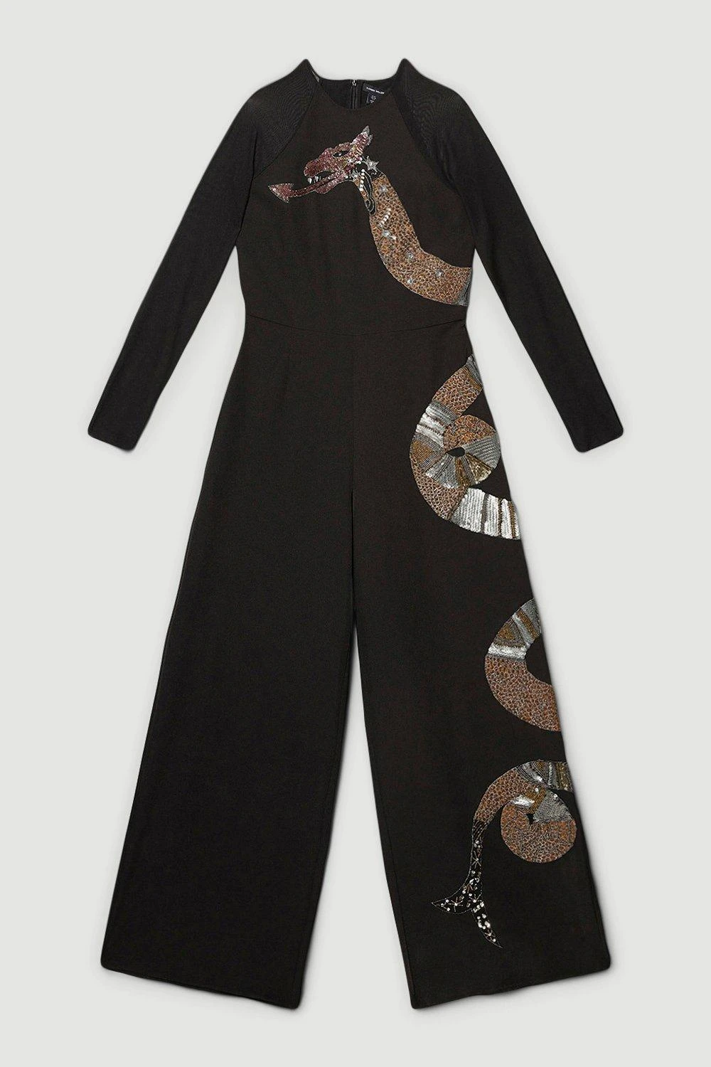 The ultimate party piece, this embellished jumpsuit promises to steal the spotlight. A striking dragon motif entwines the silhouette, made up of hand-embroidered sequins and beads crafted in shades of copper, pink, silver and gold. Mesh sleeves add elevated appeal, while wide leg trousers allow for a flattering fit.