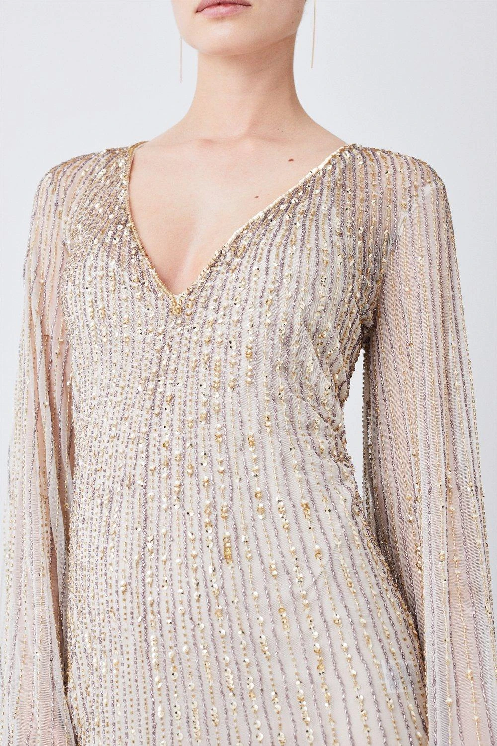 Karen Millen Petite Sheer Crystal Embellished Kimono Sleeve Fringe Maxi