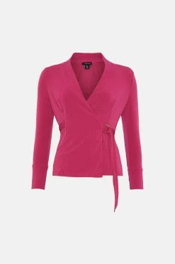 Graceful lines define this slinky wrap top. Draped over the form with languid ease, this piece defines the silhouette with a D-ring belt for versatile styling.
