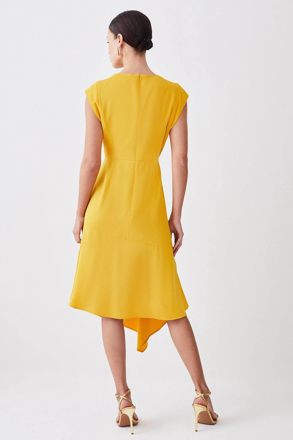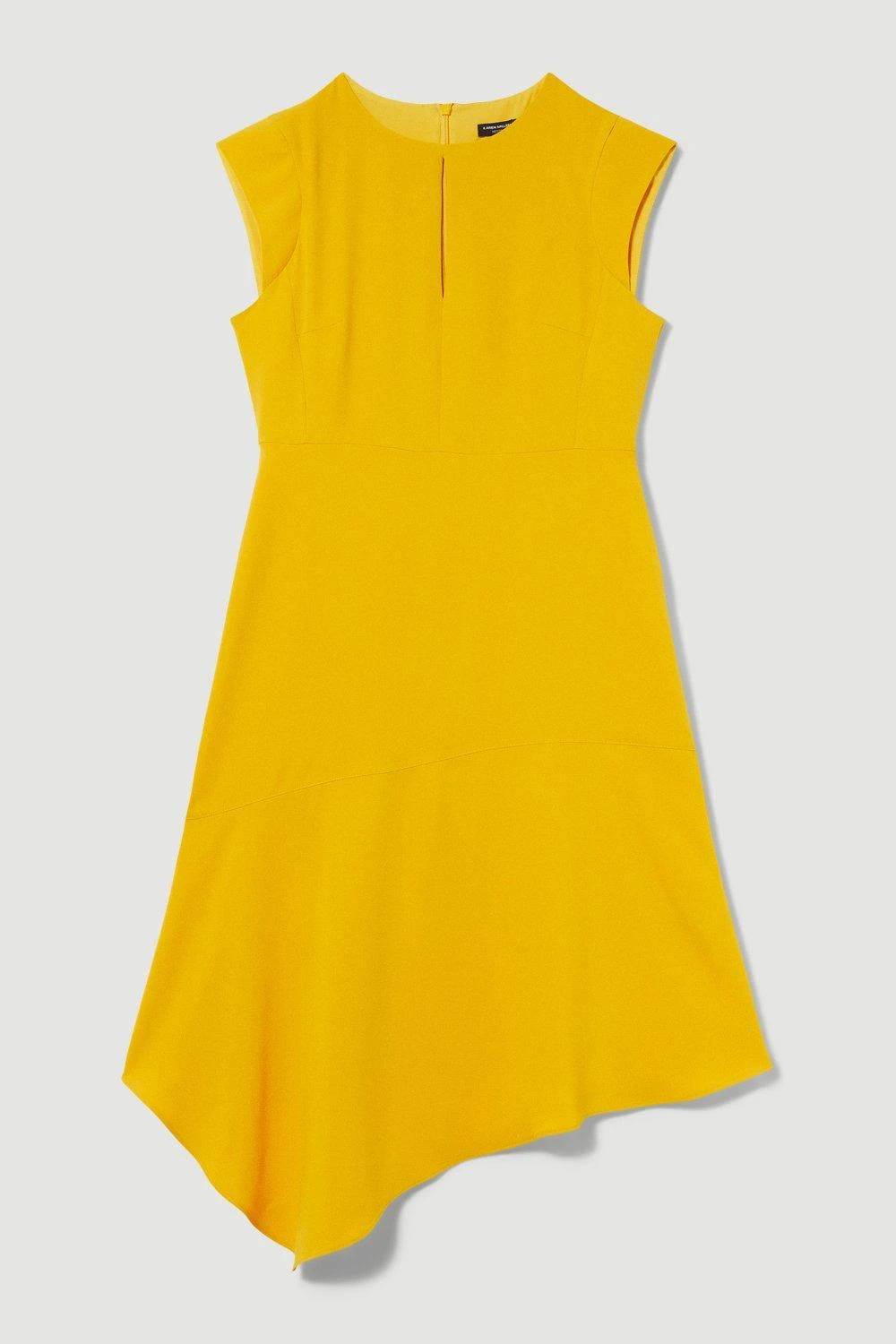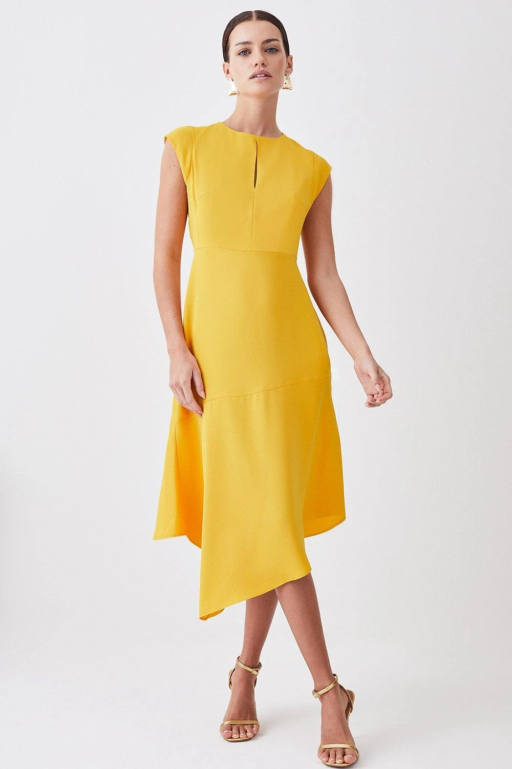 Cascading with elegant allure, this classic dress will prove to be a favourite for years to come. An asymmetric hemline gives this piece a feminine touch, will cap sleeves and a round neckline add a sense of sophistication. Style this dress with strappy heels and accessories for your next event.