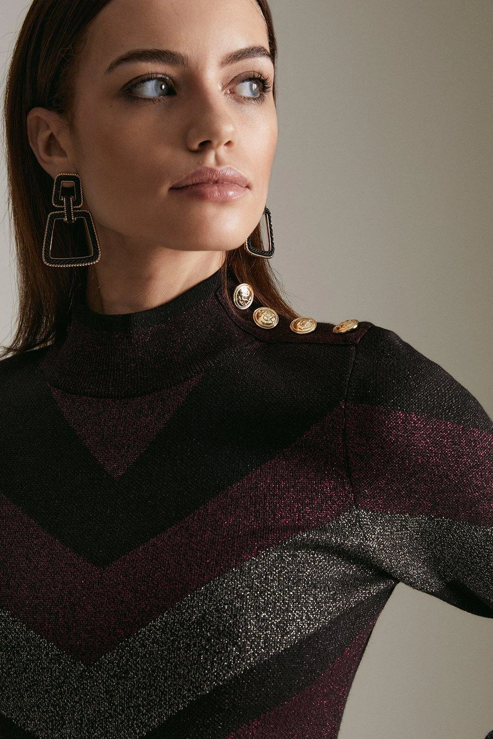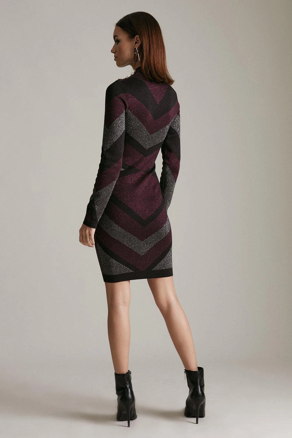 A suitably sultry choice for after-dark occasions, our sparkling knitted dress showcases modern chevron shapes and a subtle military-inspired feel. Its flattering high neckline and glossy shoulder rivets offset a figure-hugging silhouette and flirty above-knee hem.