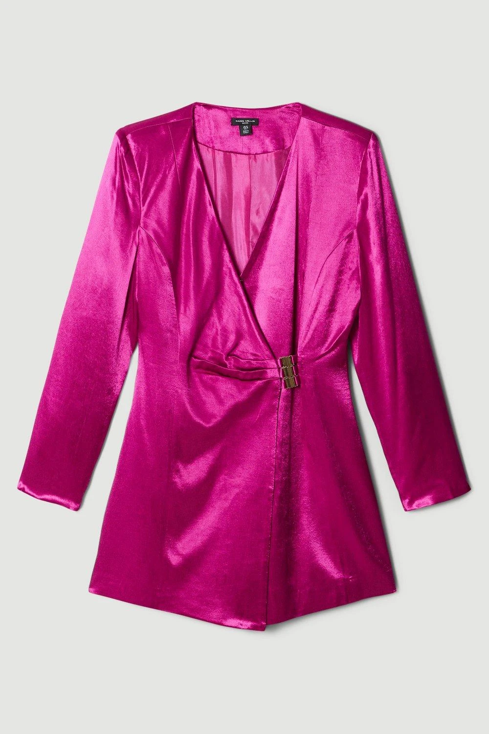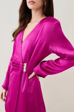 Draped with elegant aplomb, this satin mini dress defines the form with a wrap waist. Punctuated by the glossy addition of gold-tone hardware, pair with polished hoops to offset the lustrous assemblage.