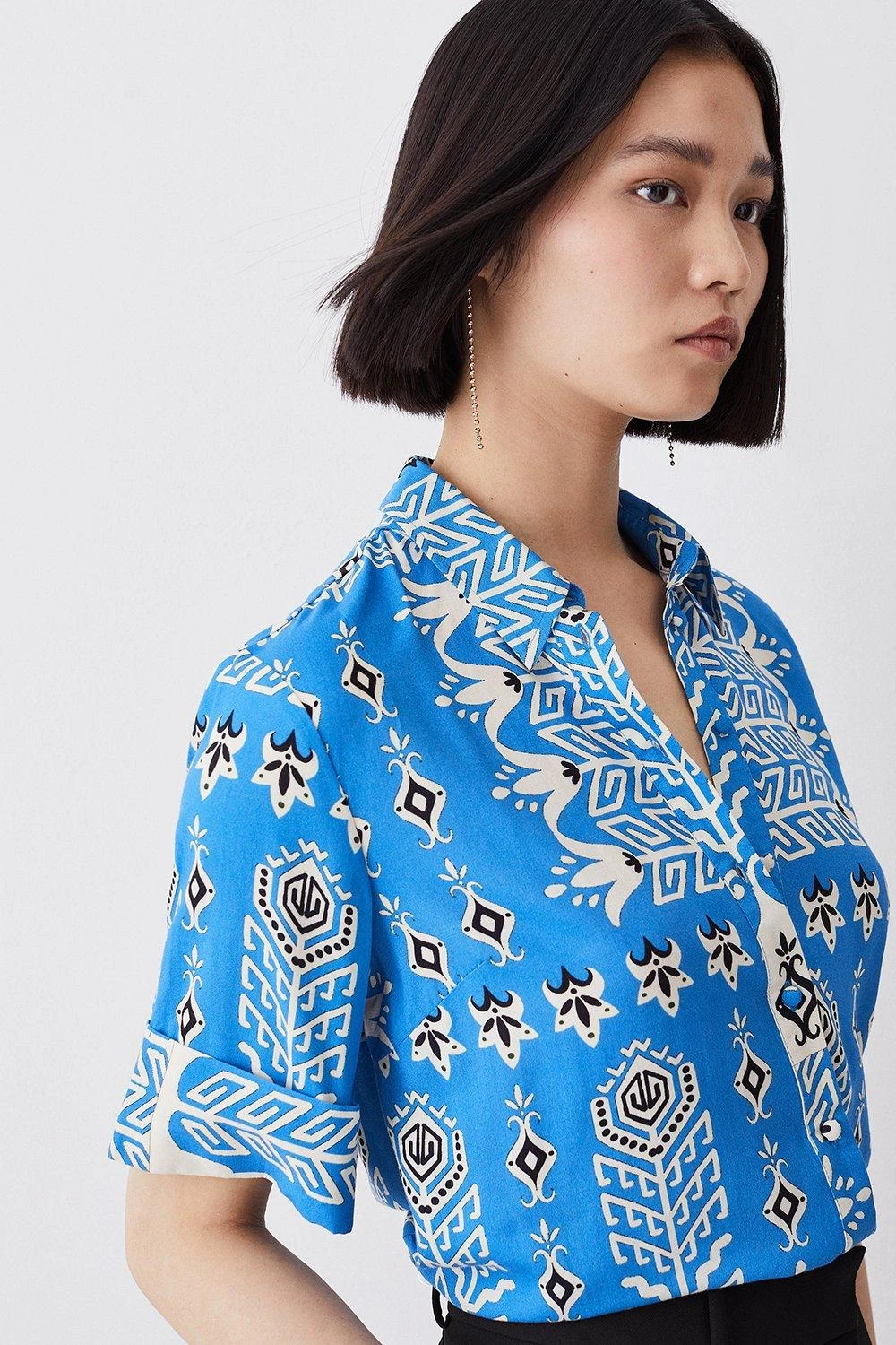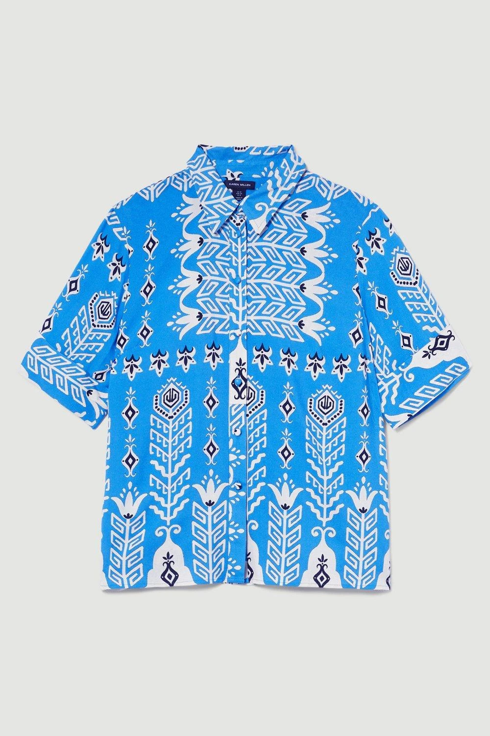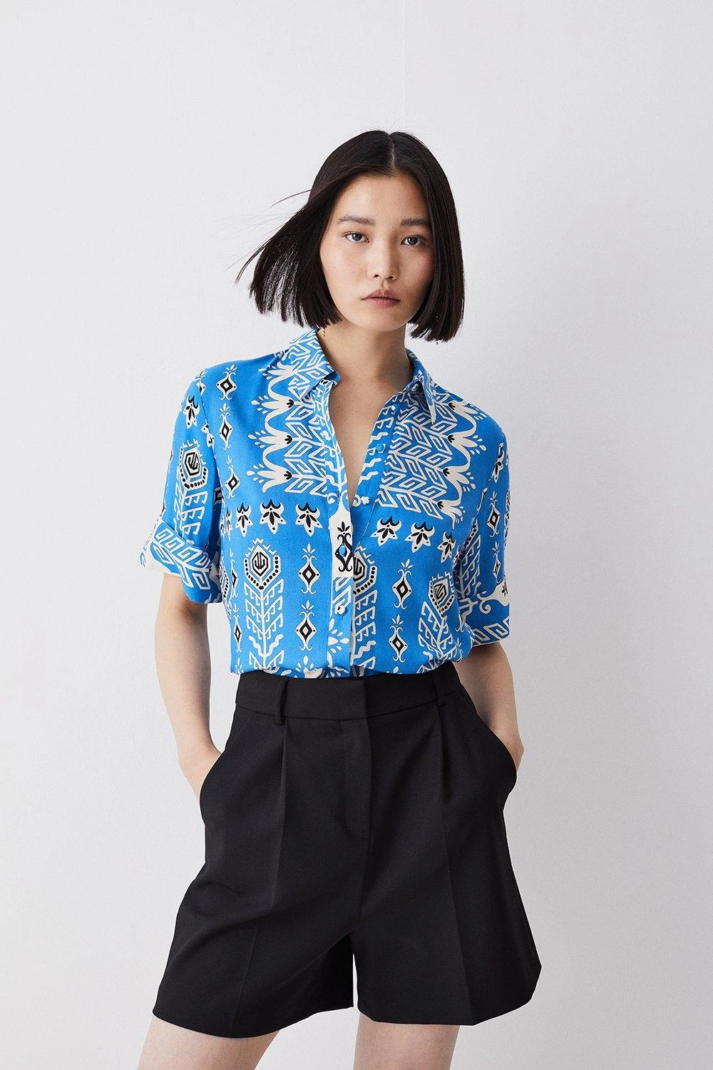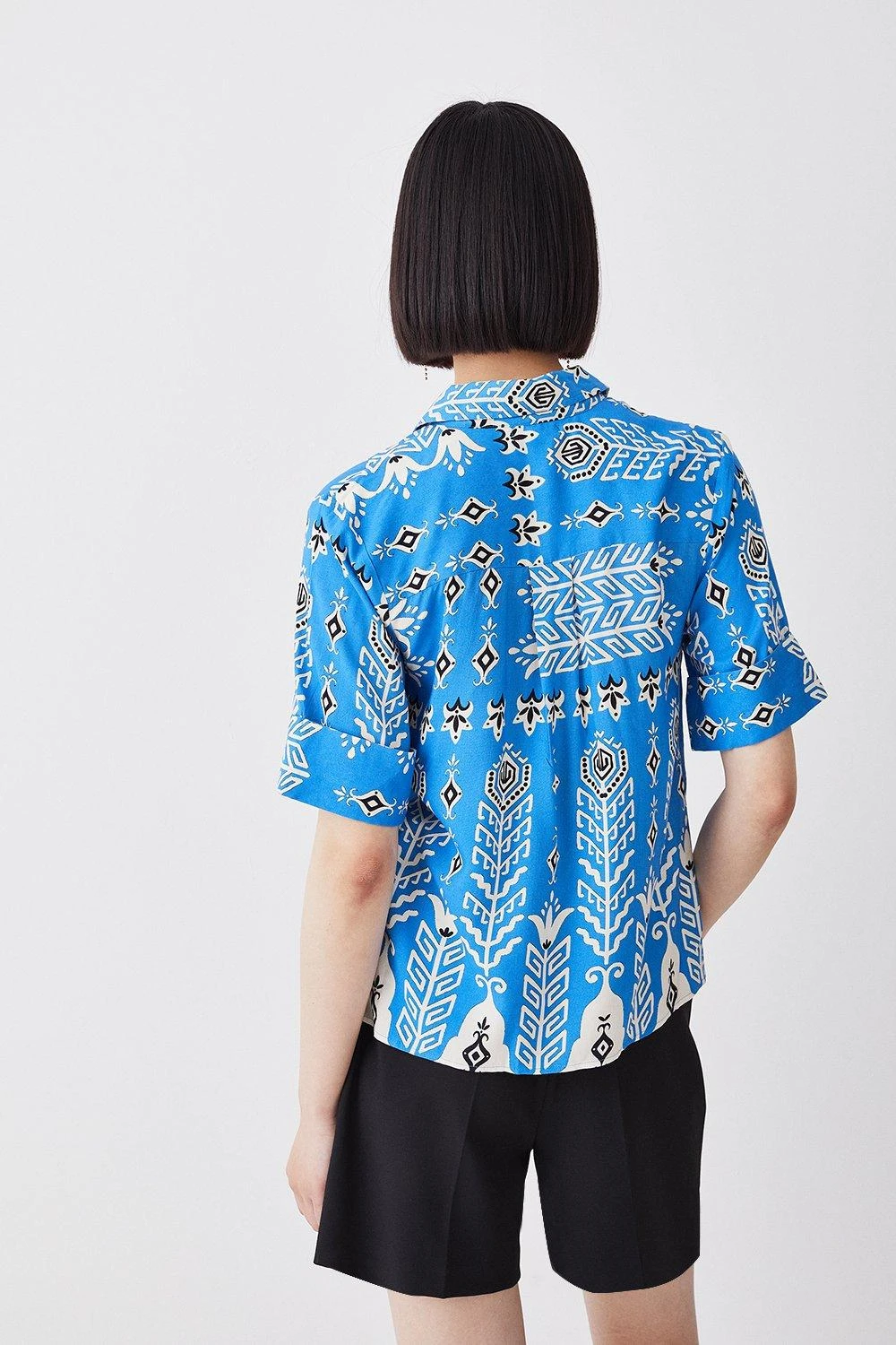 Woven in a vibrant blue hue reminiscent of cloudless summer skies, this short-sleeved shirt exudes summer optimism. A bohemian print adds a playful touch, while a collared neckline and upturned cuffs add a sophisticated finish.