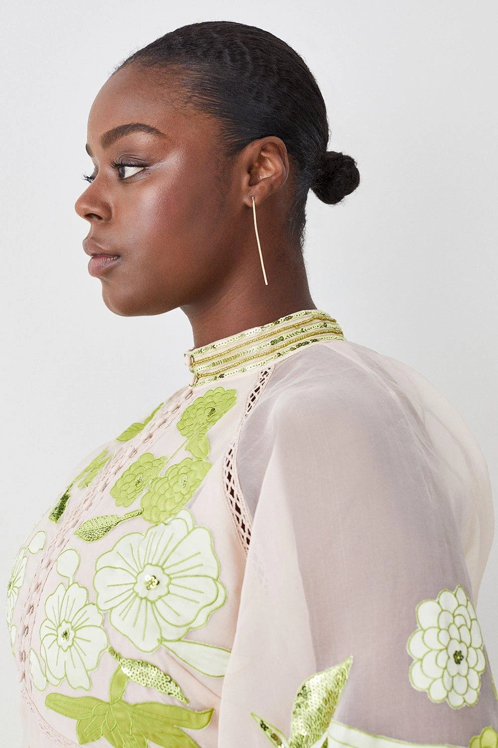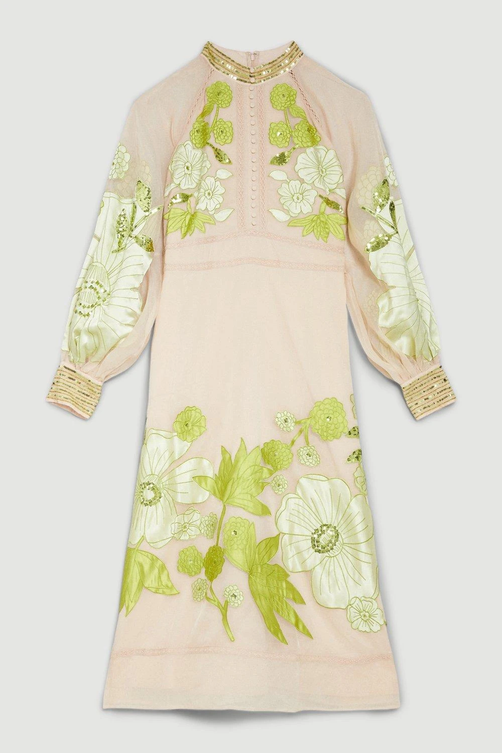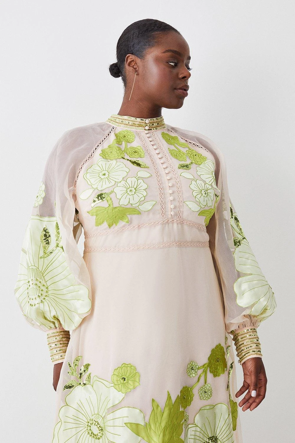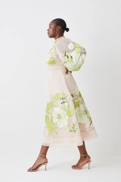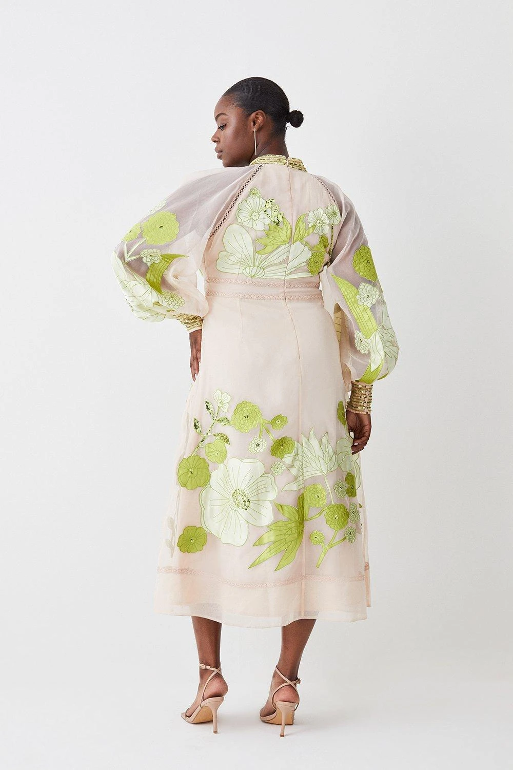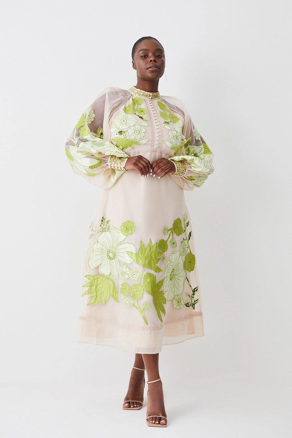 Crafted with vibrant floral applique motifs, this refined organdie dress exudes understated elegance. Intricate sequin embellishments around the neckline and cuffs add a glamorous touch, while sheer balloon sleeves add an ethereal element.