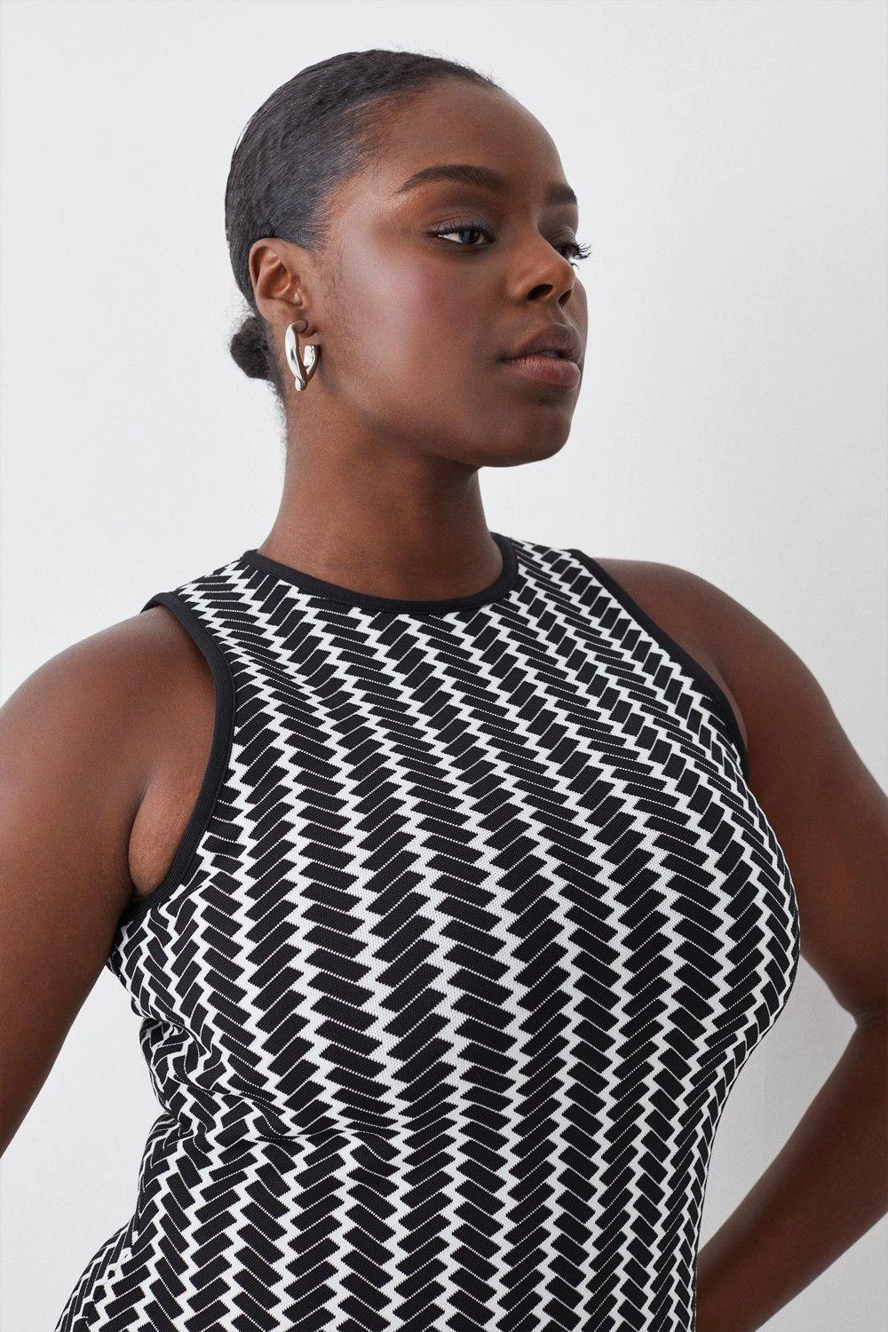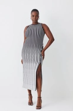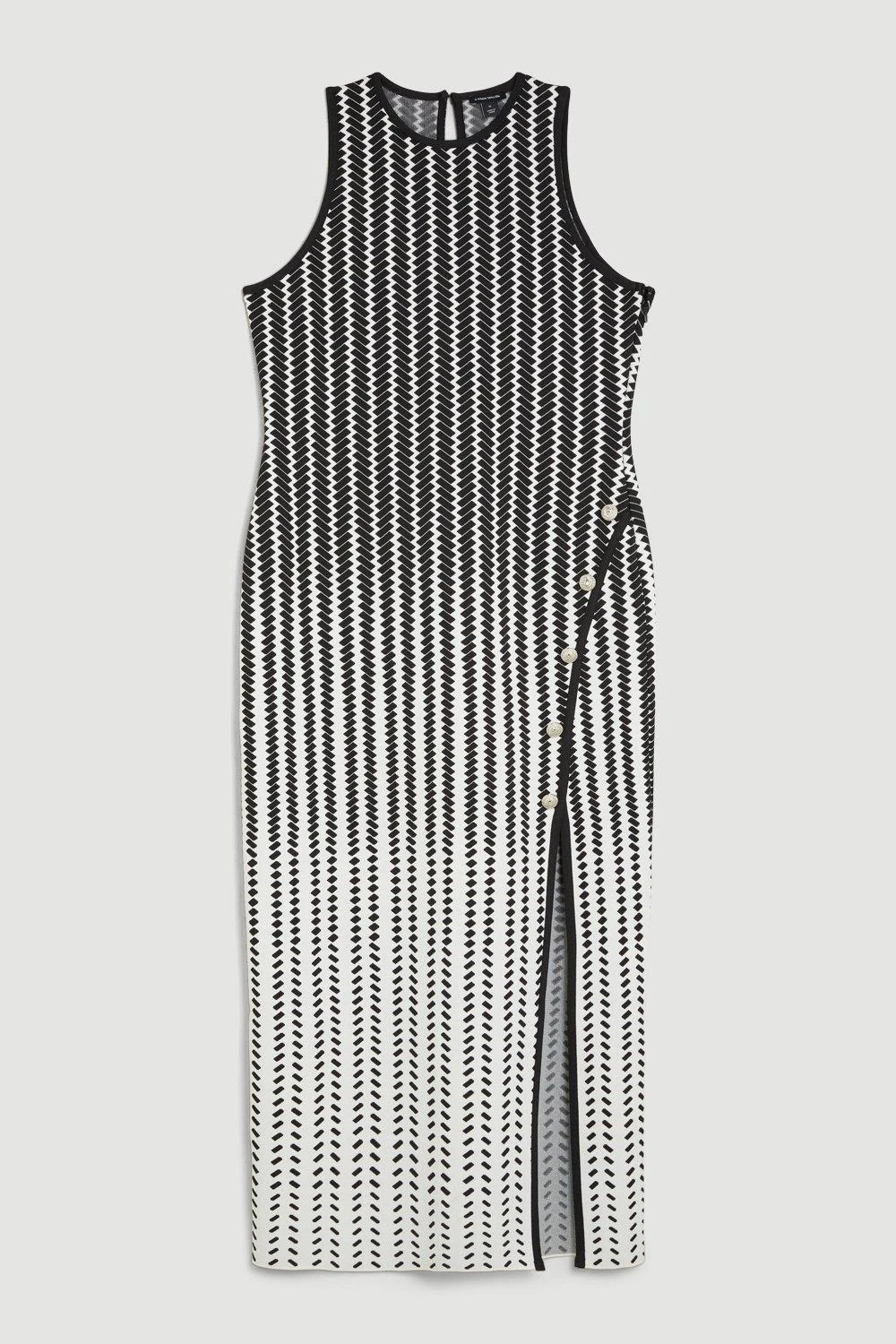 Crafted in an intricate geometrical pattern, this dress exudes contemporary appeal. An ombre design creates an optical illusion, while a lightweight knit fabric gently hugs the form. Embossed buttons add a premium finish.