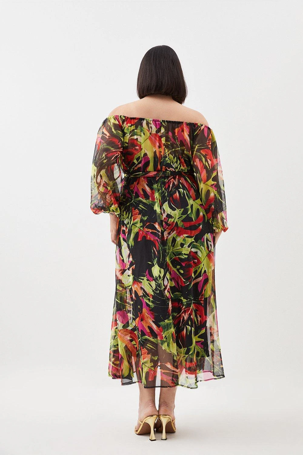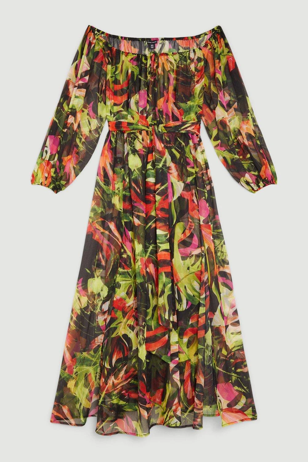 Karen Millen Plus Size Floral Palm Bardot Belted Woven Beach Maxi Dress