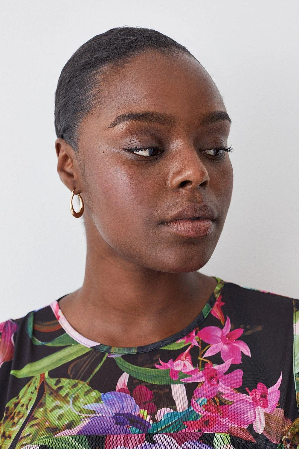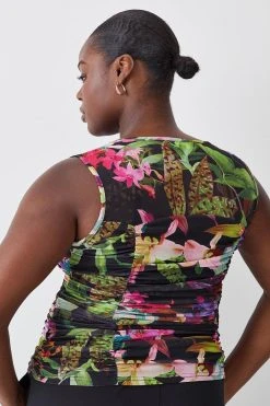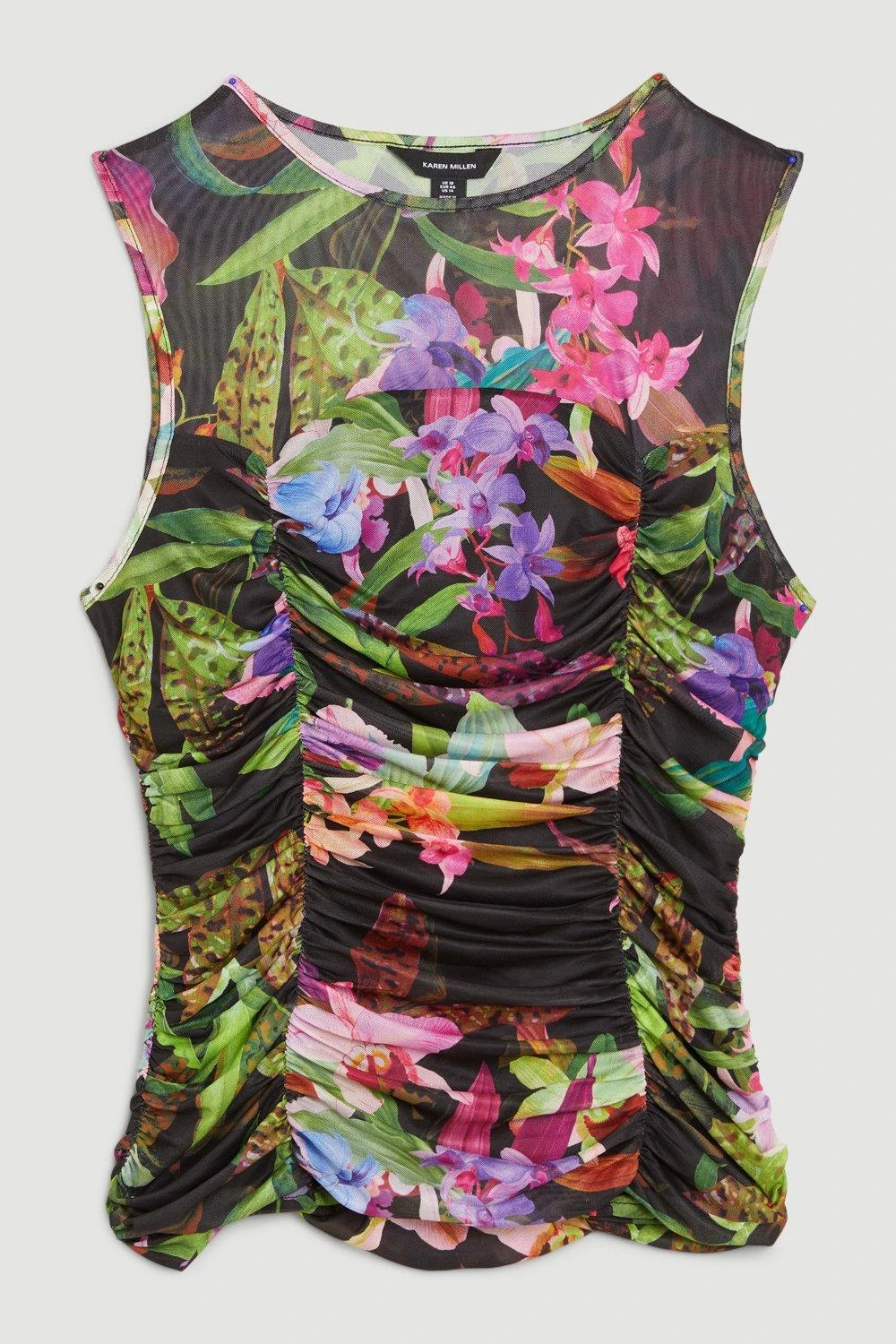 Designed with ruched jersey fabric, this sleeveless top is both flattering and bold. Vibrant shades stand out against an inky backdrop, while an intricate floral print adds a joyful mood.