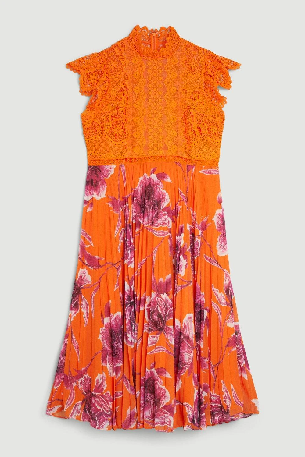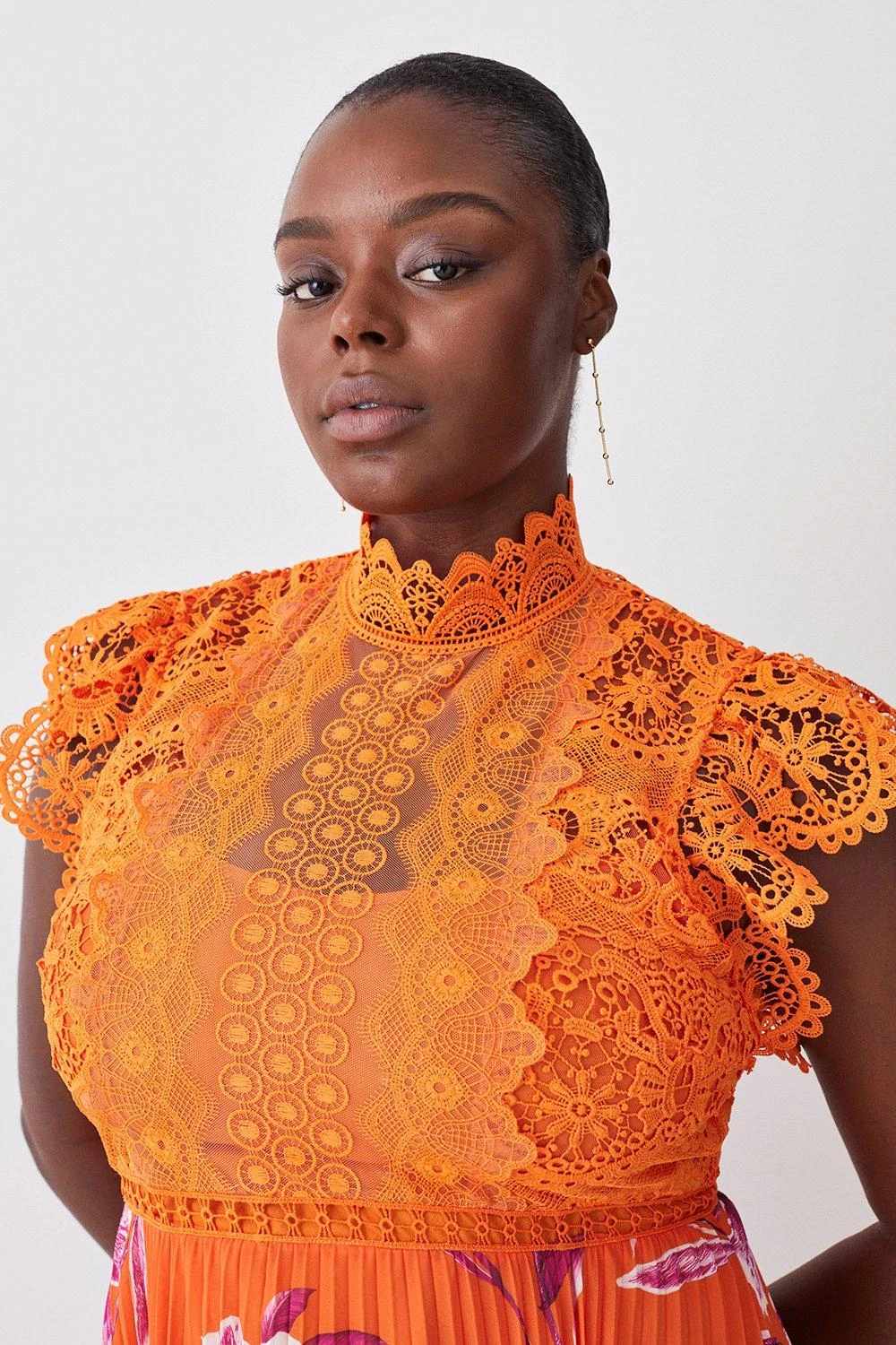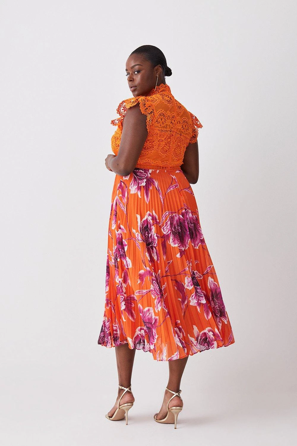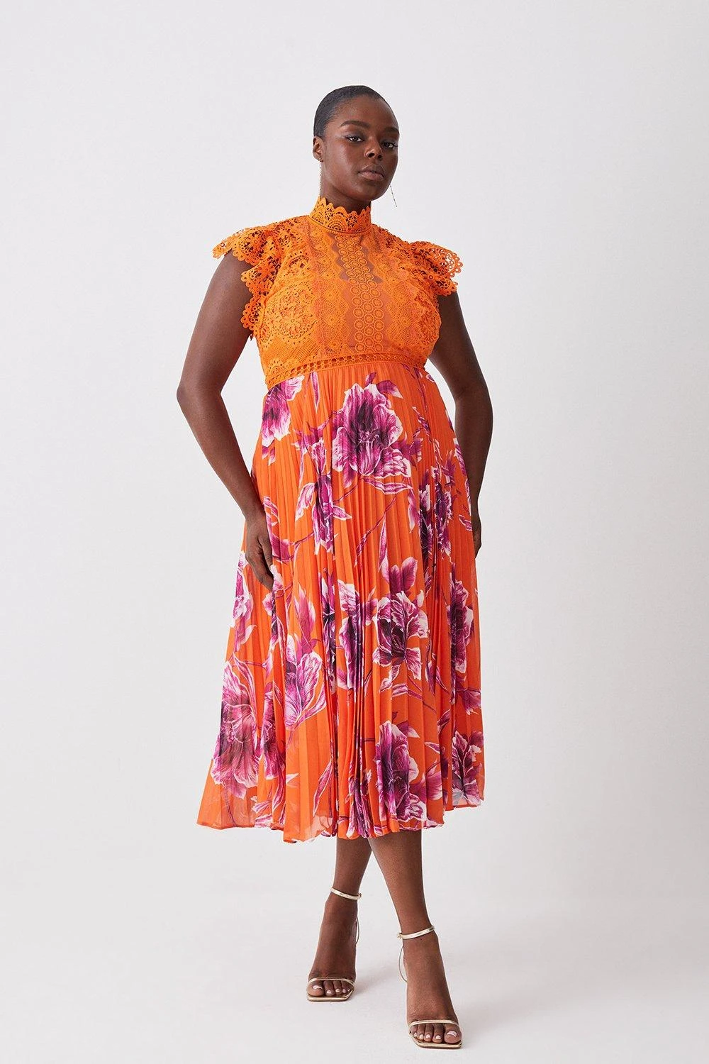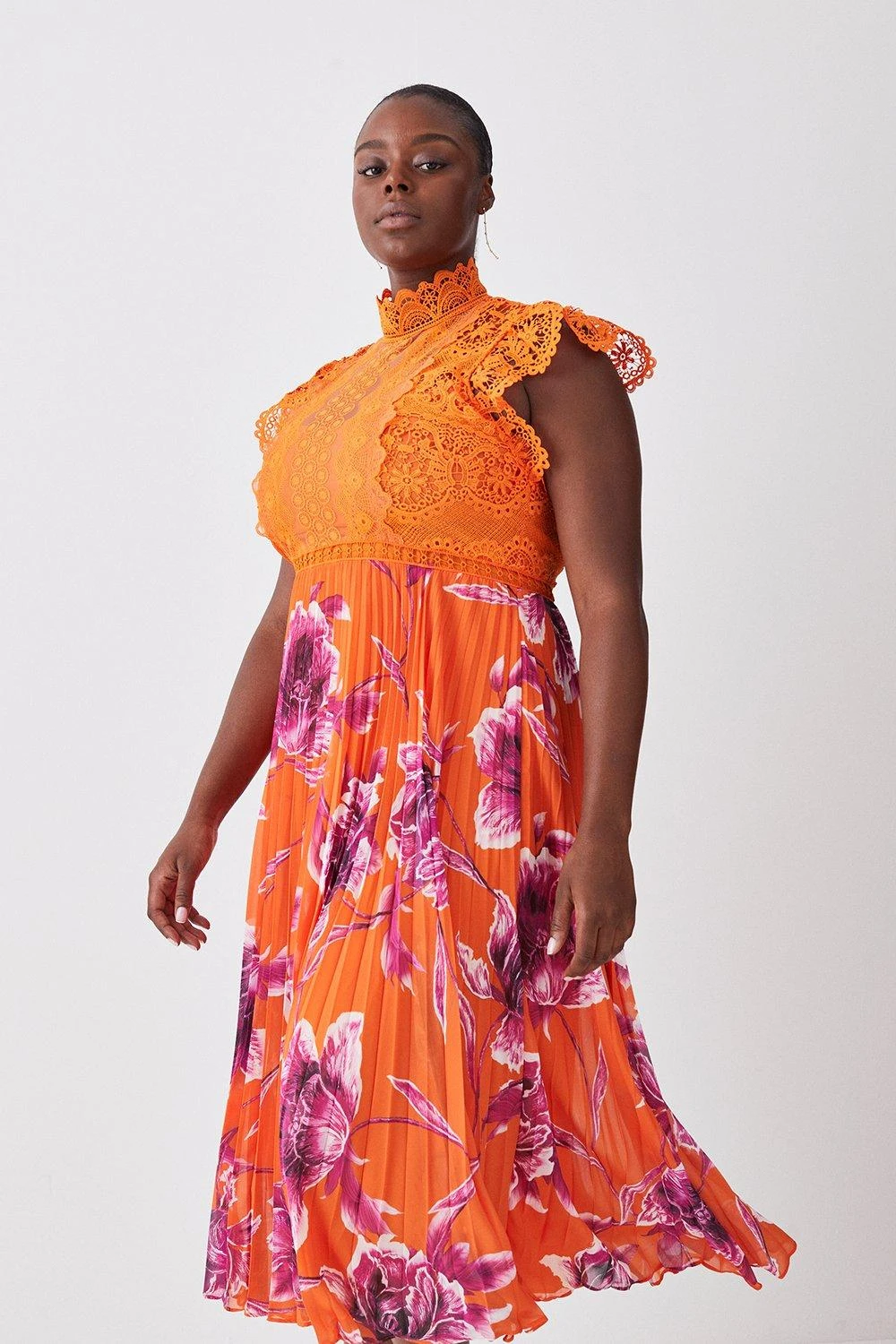 Karen Millen Plus Size Guipure Lace Mirrored Floral Pleat Midi Dress