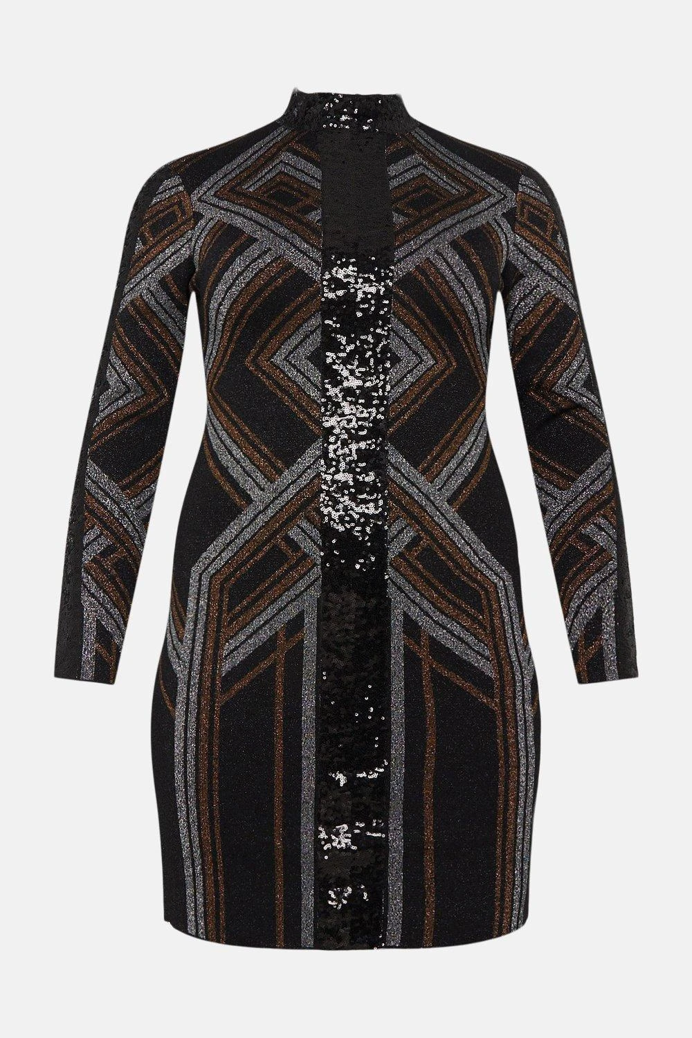 Designed to enhance hourglass figures, this jacquard mini dress shows off a sleek, streamlined silhouette defined by its high neckline and long, form-fitting sleeves. Sprinkled with sequins in a retro, geometric pattern, it catches the light with every step and looks undeniably daring paired with sky-high heels and a smile.