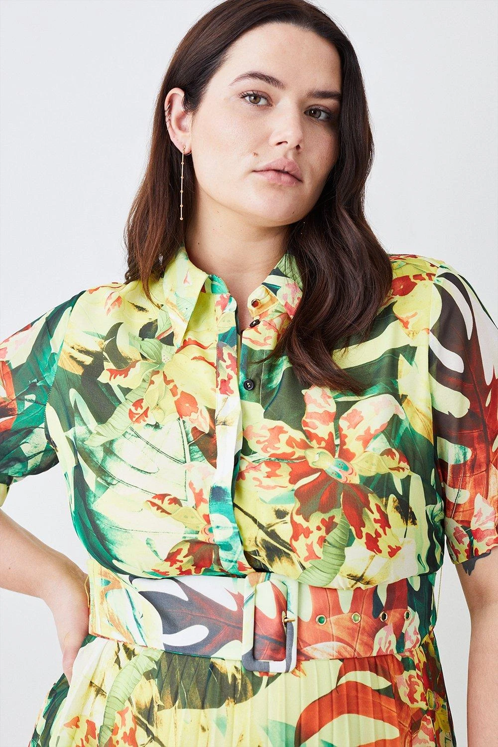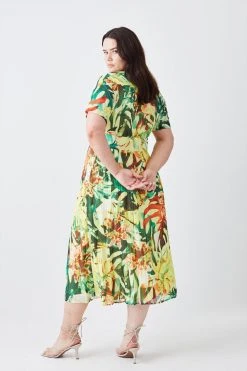 Karen Millen Plus Size Jungle Print Georgette Pleated Midi Shirt Dress