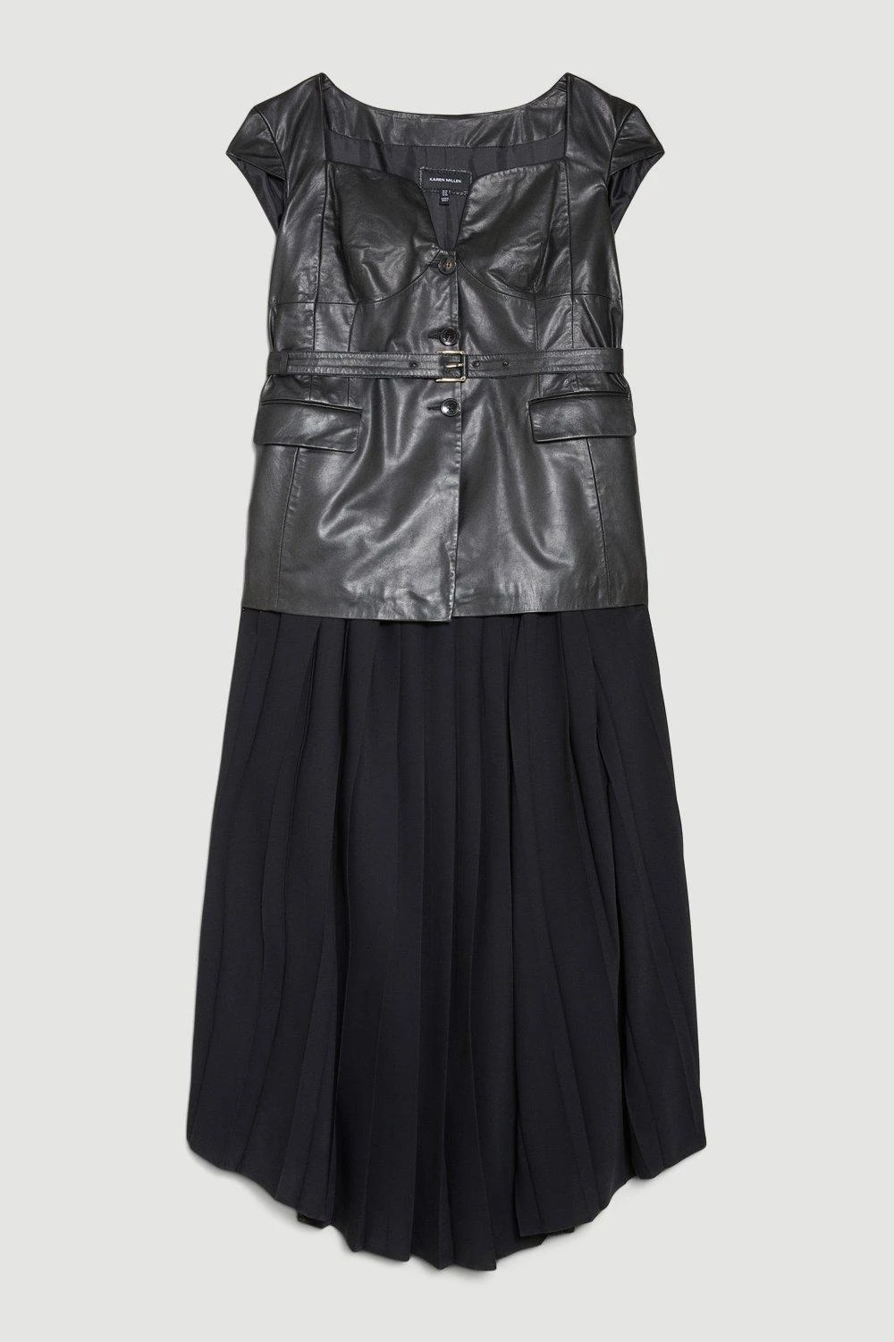 This sleek garment is crafted with a fashion-forward leather bodice which is beautifully juxtaposed by a flowing pleated skirt. A sweetheart neckline frames the silhouette, while a belted waist adds definition.