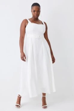 Updating a classic retro-style silhouette with a linen construction, this premium midi dress makes a considered choice for warm weather soirees. This design features a timeless square neckline, buckle belt and full-bodied skirt for a demure, polished finish.