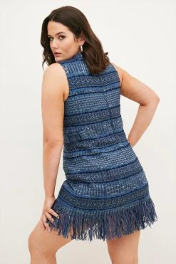 Main: 40% Polyamide, 28% Cotton, 21% Polyester, 5% Viscose, 3% Virgin Wool, 3% Acrylic. Lining: 97% Polyester, 3% Elastane. Dry clean only. Model wears a UK 18/ US 14. Length of a UK 18: approx 95cm (including fringing).