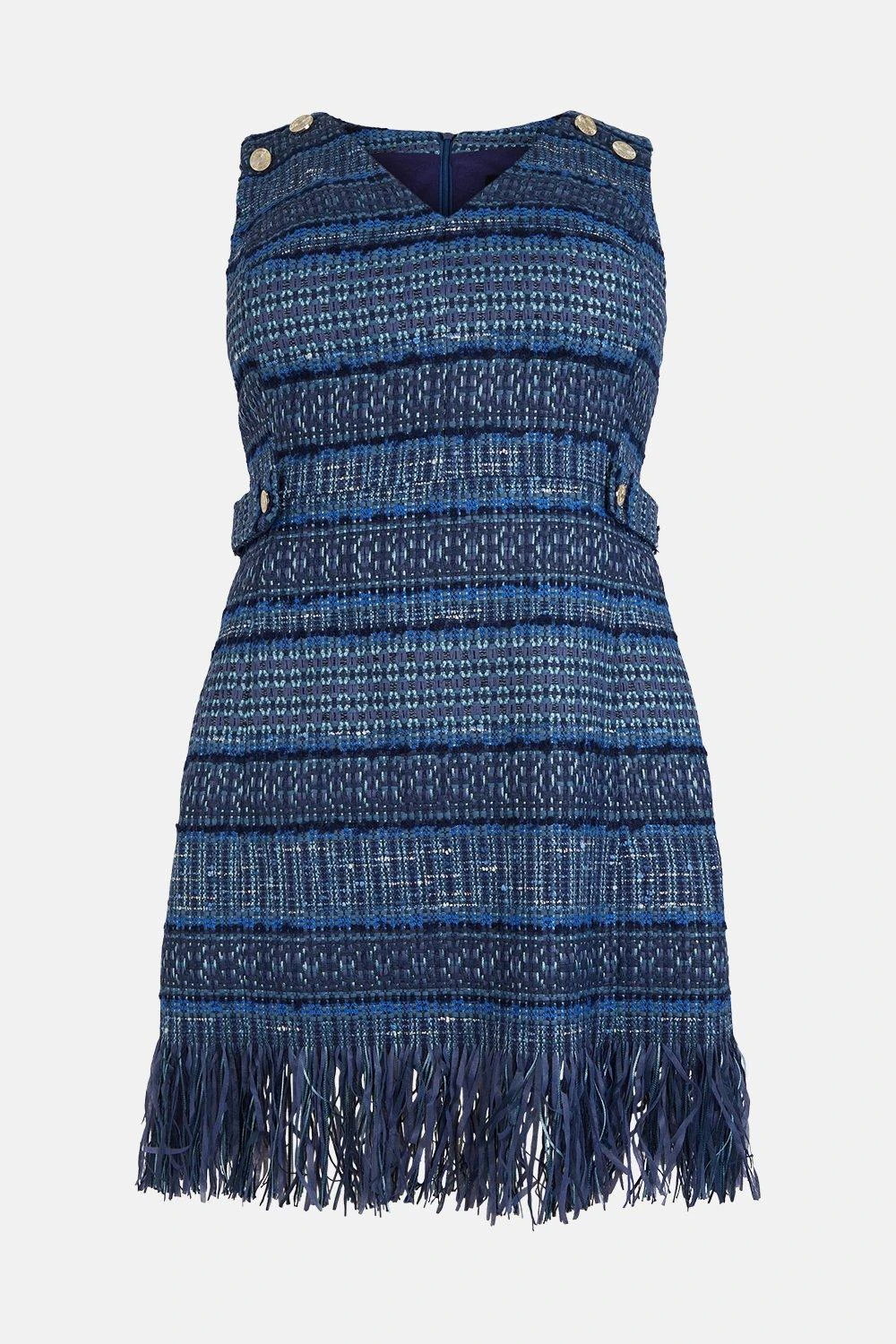 Tweed, revamped. Spun from signature Italian fabric infused with virgin wool for a textured finish, this sophisticated V-neck dress makes a truly unique addition to your new-season repertoire. It comes accented with glossy gold buttons, a belt-trim waistline and a fringed hemline for added swish and fastens neatly with a concealed back zip closure. Let the bold motif shine by styling it with colour-pop accessories.