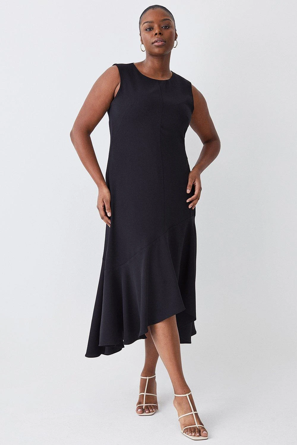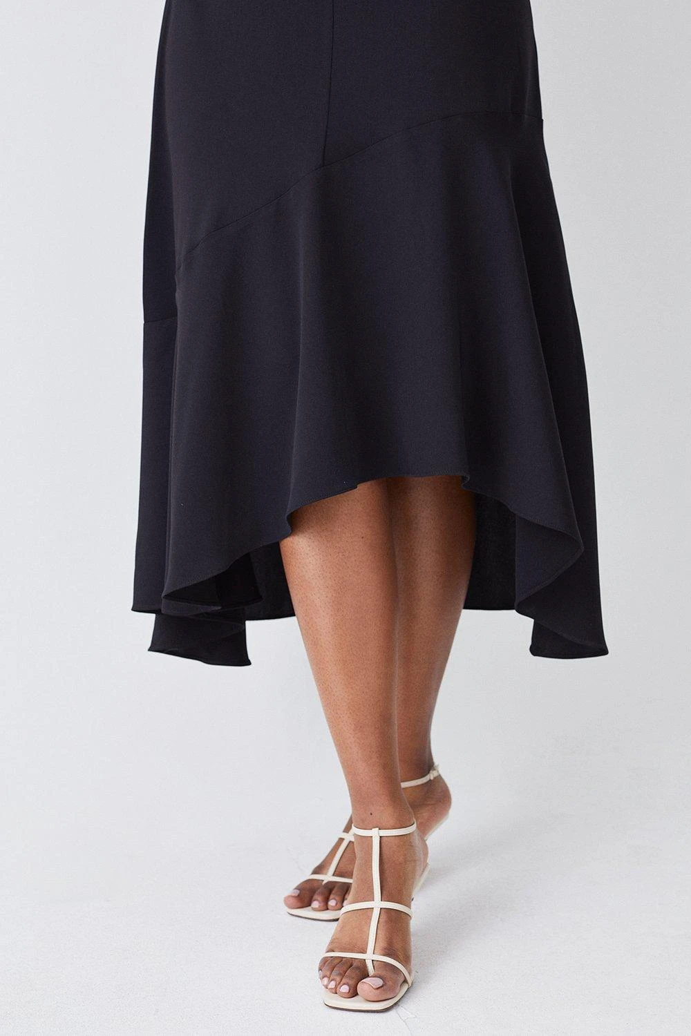 This midi dress is a champion of effortless elegance. A waterfal hemline gracefully falls fown to a midi hemline, while a rounded neckline adds a sophisticated touch. Style this piece with strappy heels for your next event.