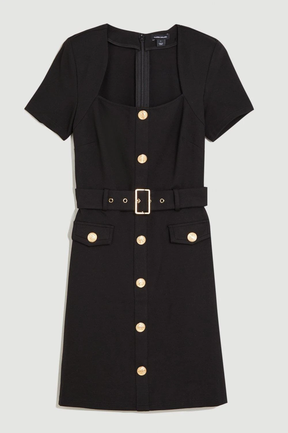 Embody a timeless and sophisticated aesthetic in this sharp mini dress. Accented with embossed gold buttons, this piece embodies a sense of vintage glamour. A square neckline paired with short sleeves adds undeniable elegance, while a buckle belt sculpts the silhouette. Style this dress with slingback heels and accessories for an elevated day-to-night ensemble.