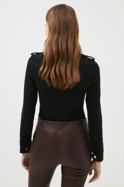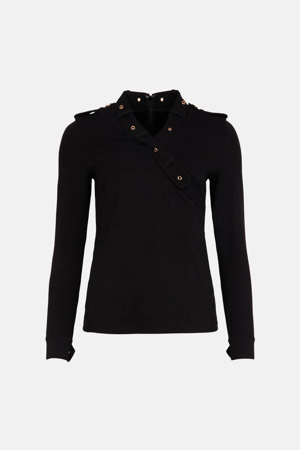 Boasting bold rivet-studded tabs that frame the neckline, this ponte wrap top introduces some much-needed edge to any separates collection. It comes detailed with buttoned epaulettes for a modern military spin and fits close to the figure for a streamlined effect – tuck it into high-waisted trousers for a put-together work or weekend look.