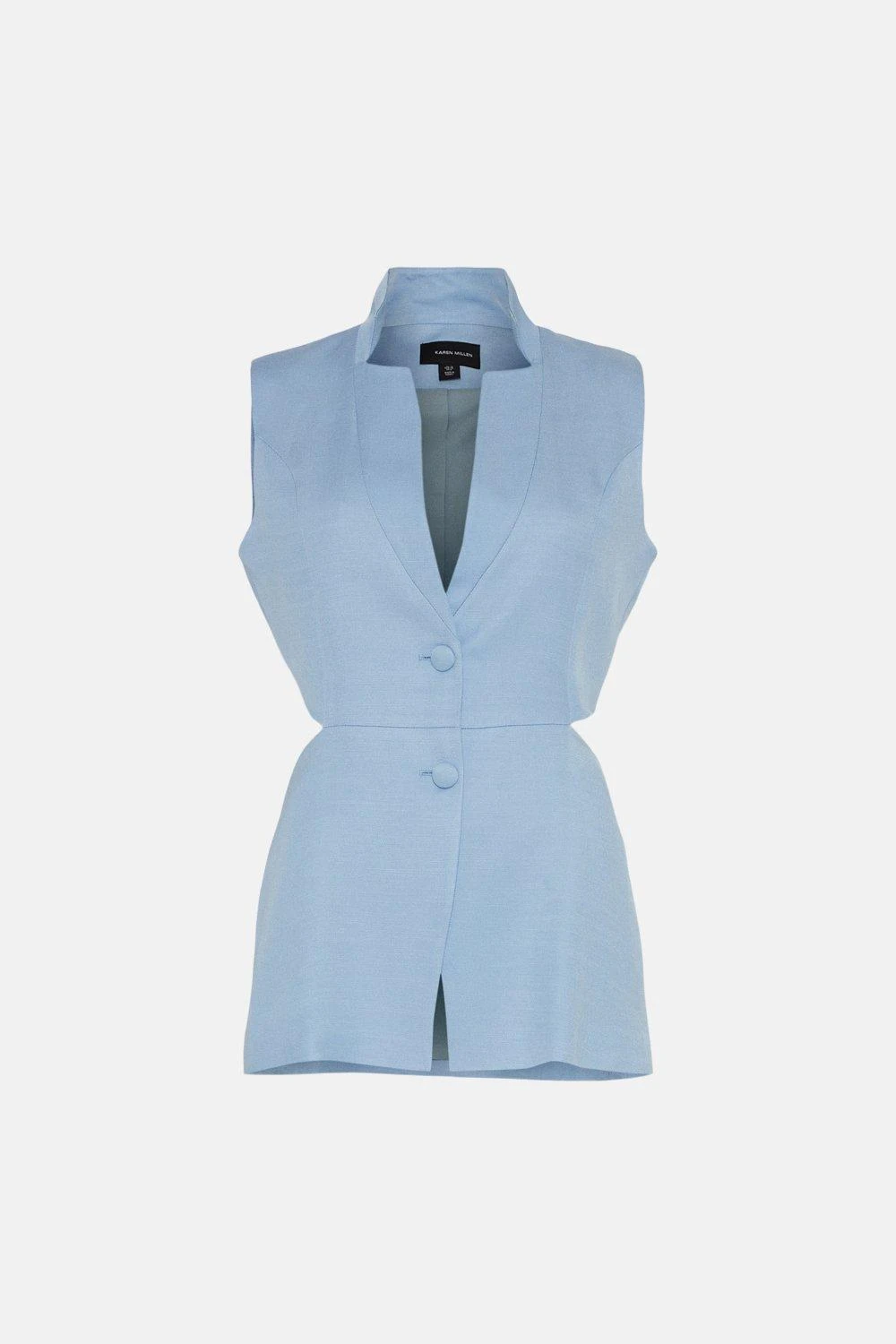 A modern take on the classic tailored waistcoat. Crafted from summer-ready linen for a crisp, natural finish, this clean-lined piece is perfect for warm work days and features edgy side cut-outs, a neat collar and two fabric-covered buttons for a final minimal flourish.