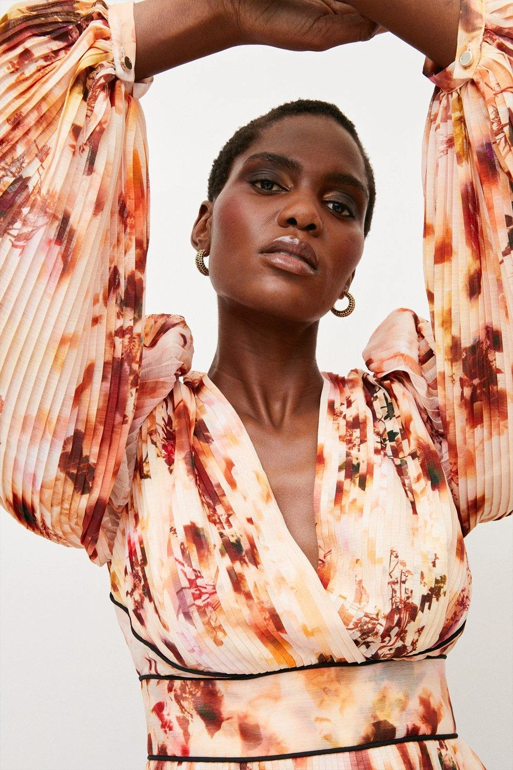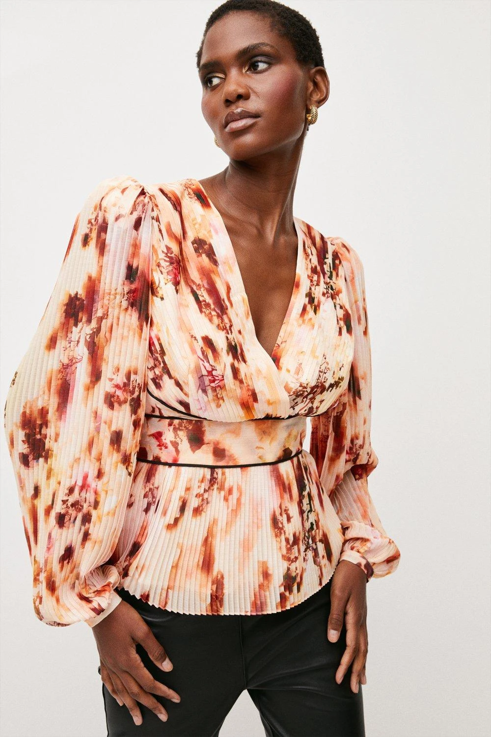 Lend a sophisticated look to your summer wardrobe with this painterly floral-print blouse. Defined by its sharply pressed pleats, V-neckline and puffed sleeves, it accentuates the decolletage beautifully and fastens with a slender tie at the back. Contrast black piping cinches in the waistline for a final feminine flourish.