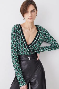 Defined by a plunge V-neckline for a sultry mood, this long-sleeved jersey top makes a bold choice for after-dark plans. An intricate geo print adds a retro mood. Style this piece with leather trousers for a striking day-to-evening look.