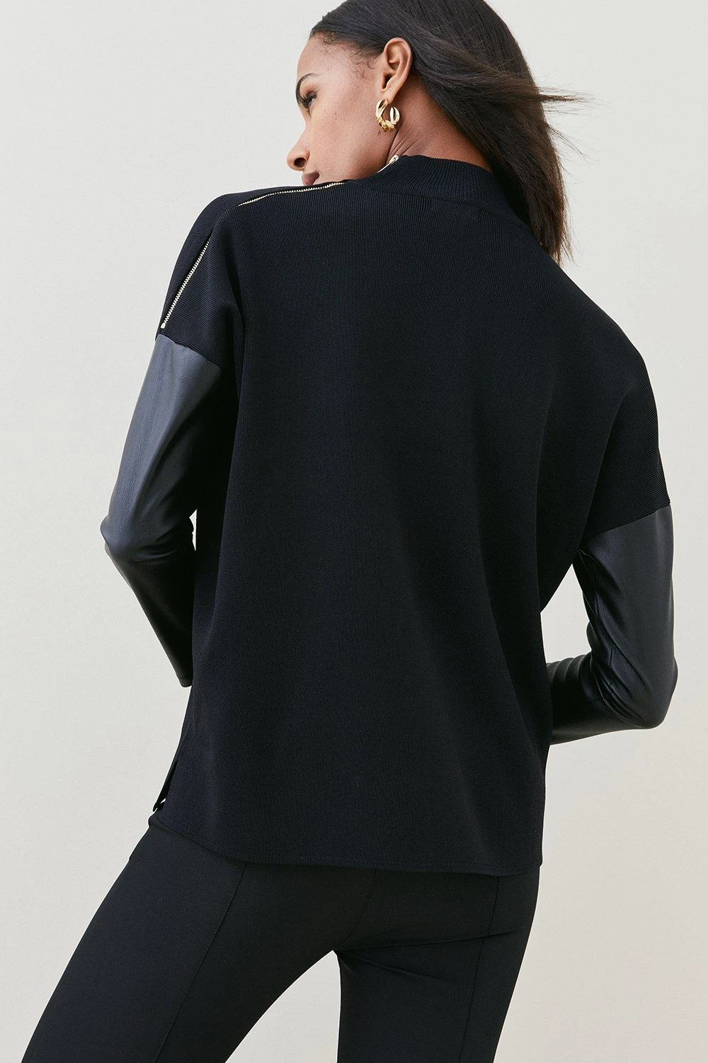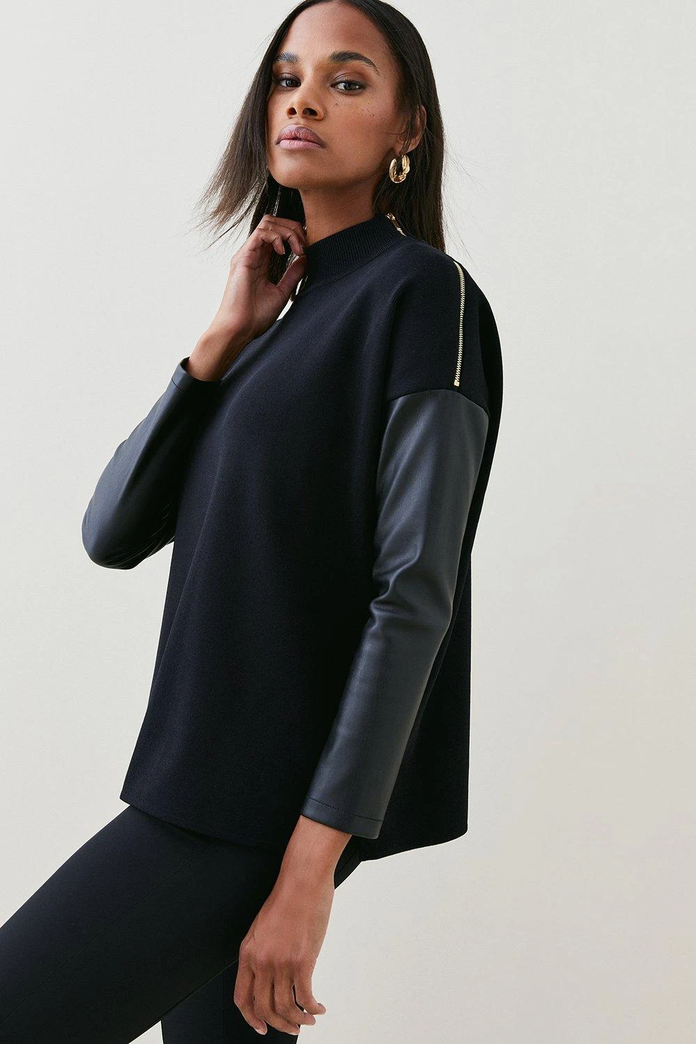 Detailed with a mock neck, zip fastening at the shoulders and faux leather sleeves, this jumper is an obvious choice to uplift any trousers. Opt for skinny leather ones for the perfect date night look.